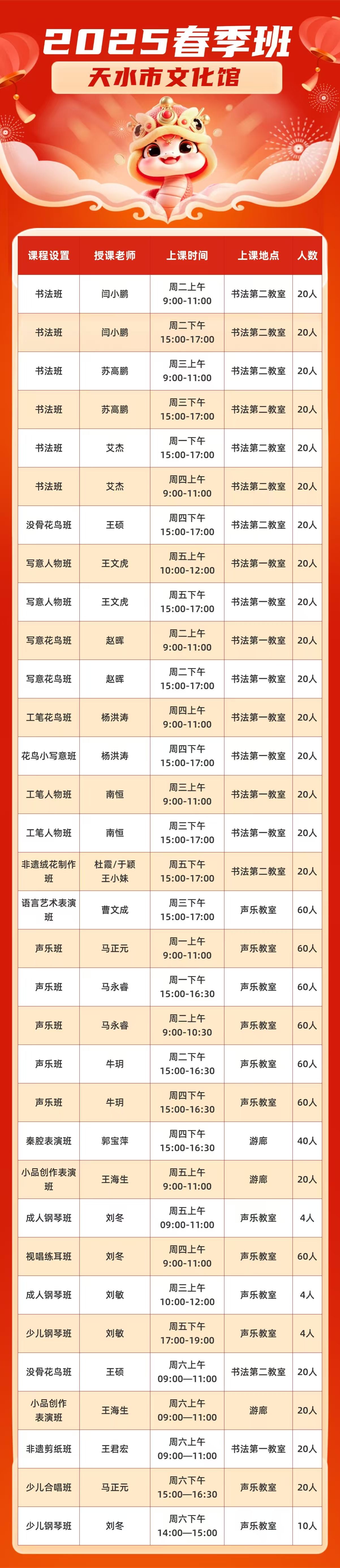 2025年3月26日至28日报名,报满为止。3月31日下午举办天水市文化馆2025年免费培训班开班仪式,4月1日正式上课。
