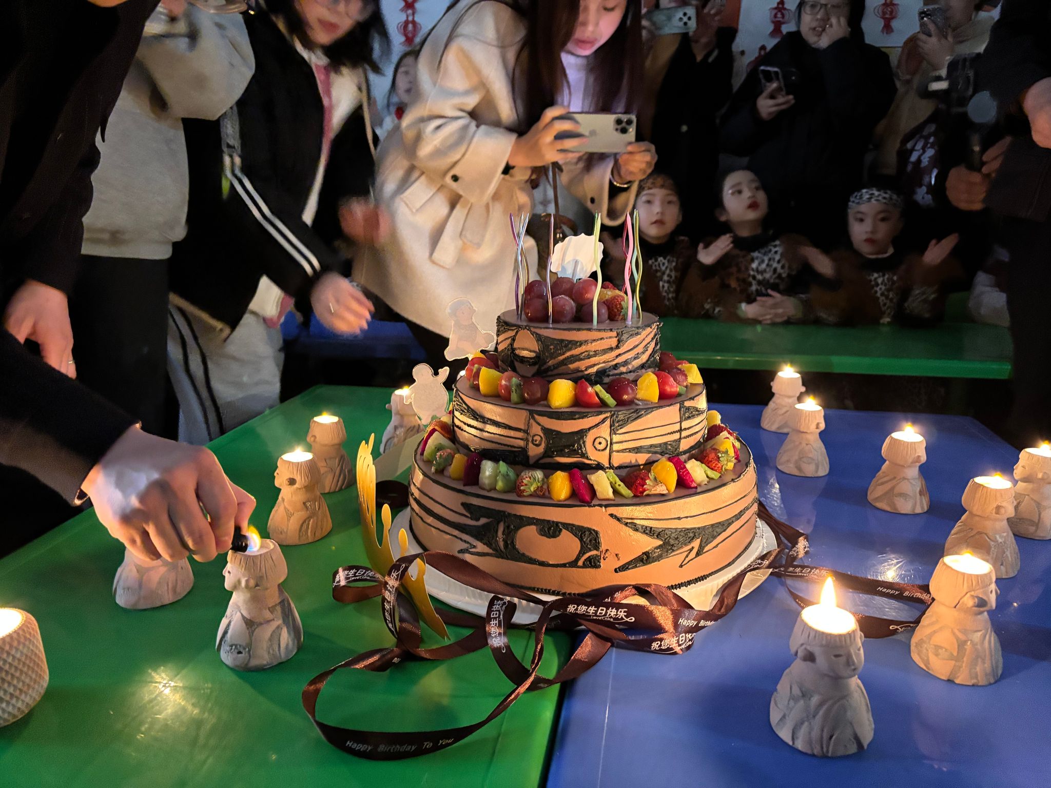 令人期待的生日蛋糕分享环节,精美的蛋糕上装饰着“小祖宗”元素和大地湾文化彩陶纹饰的图案。现场的小朋友和观众欢快的唱起了生日祝福歌,大家闭上眼睛,心里对“小祖宗”送上美好的祝福。吹灭蜡烛,蛋糕被切成小块,分发给现场的观众和小朋友们,大家一边品尝着香甜的蛋糕,一边分享着喜悦,欢声笑语交织在一起。