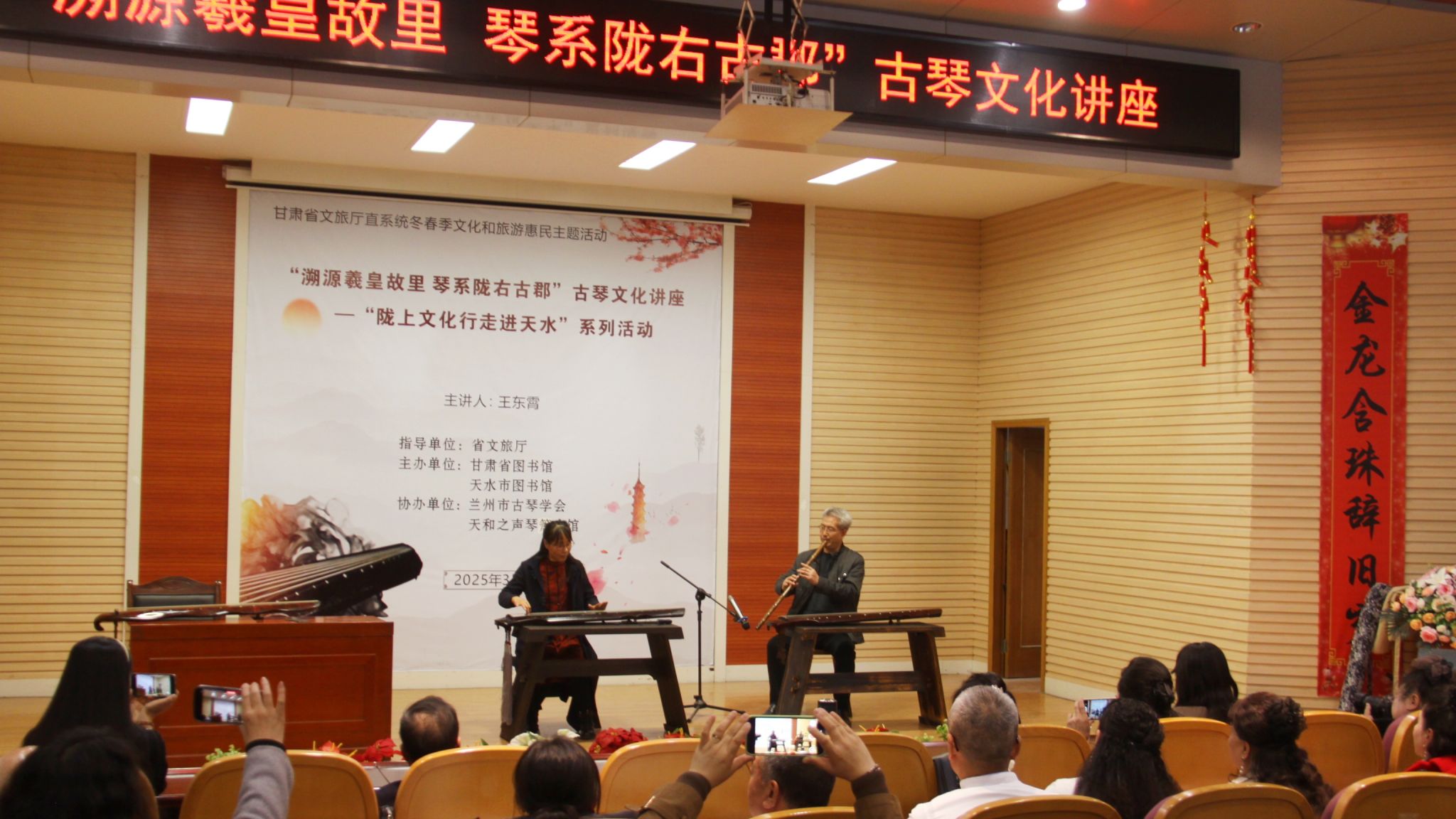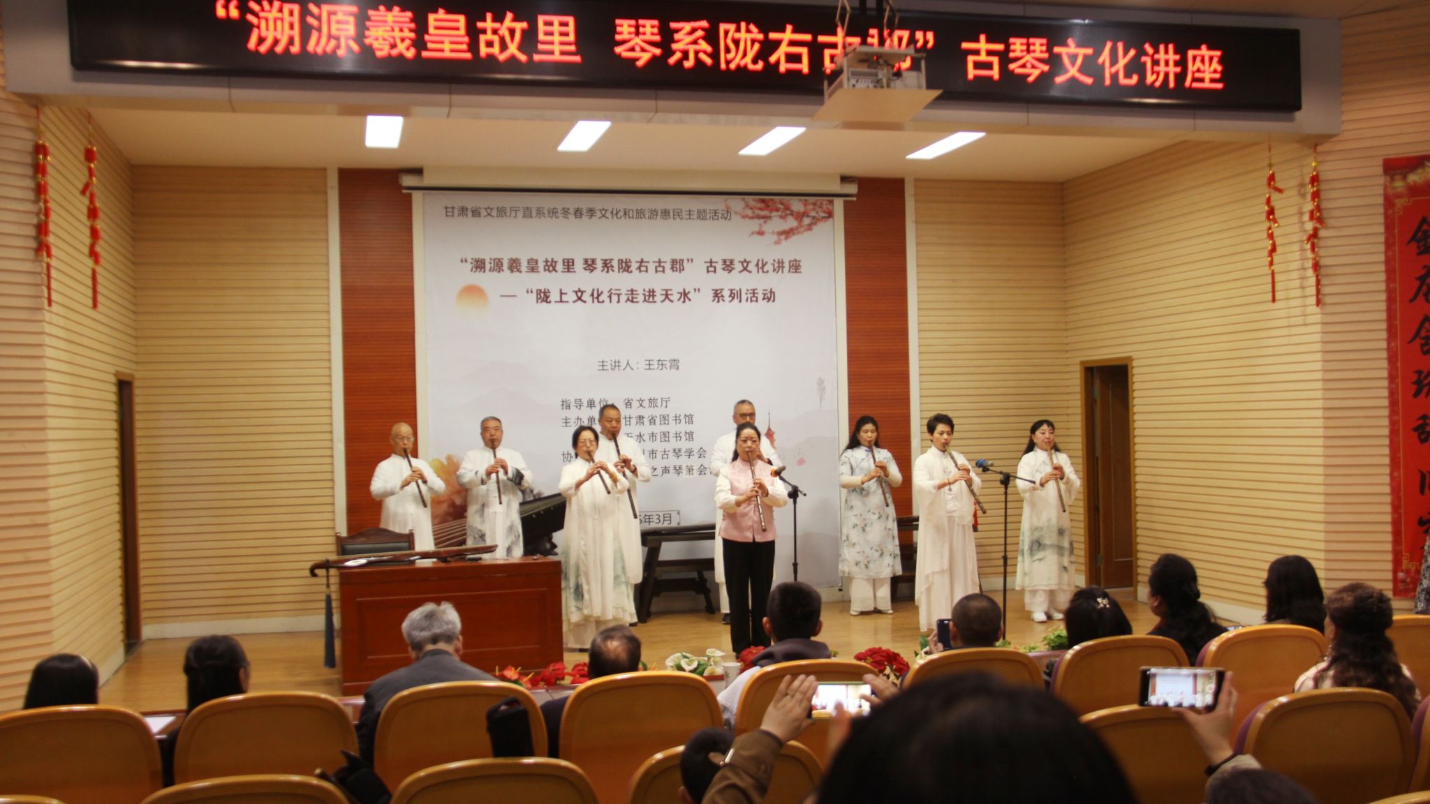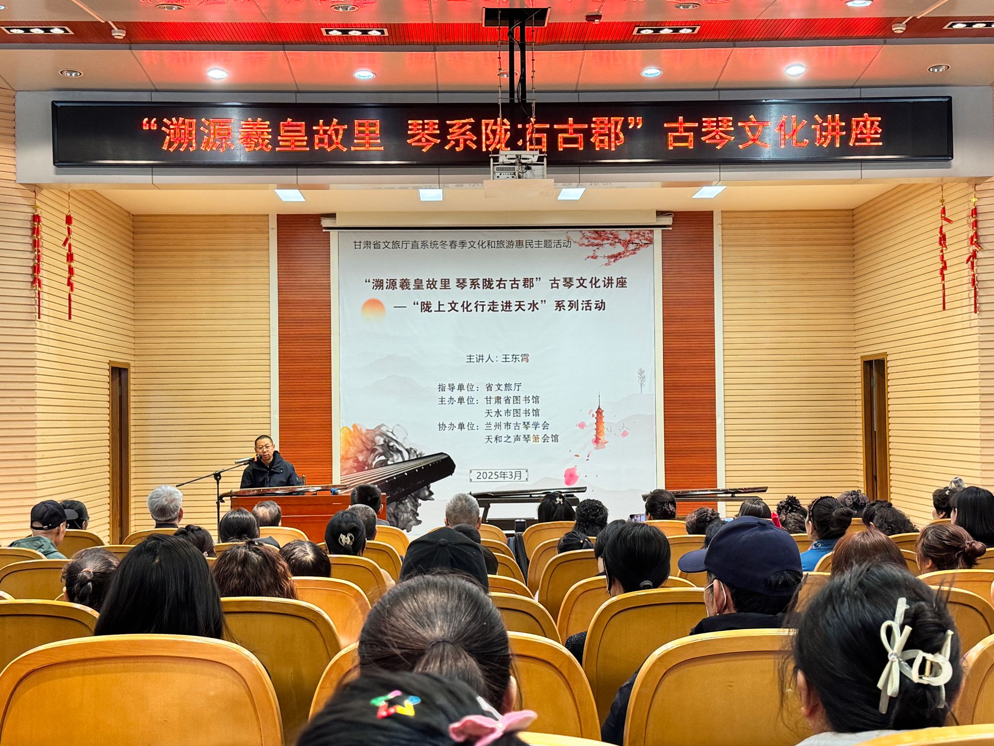 为全面贯彻落实党的二十届三中全会精神,深入学习贯彻习近平文化思想和习近平总书记视察甘肃重要讲话重要指示精神,更好地弘扬甘肃的文化之韵,3月22日下午,由省文旅厅指导、甘肃省图书馆联合天水市图书馆主办、天和之声琴箫会馆协办的“溯源羲皇故里 琴系陇右古郡”古琴文化讲座在市图书馆报告厅成功举办。兰州市古琴学会副会长、秘书长王东霄先生受邀主讲,活动吸引了200余名观众热情参与。