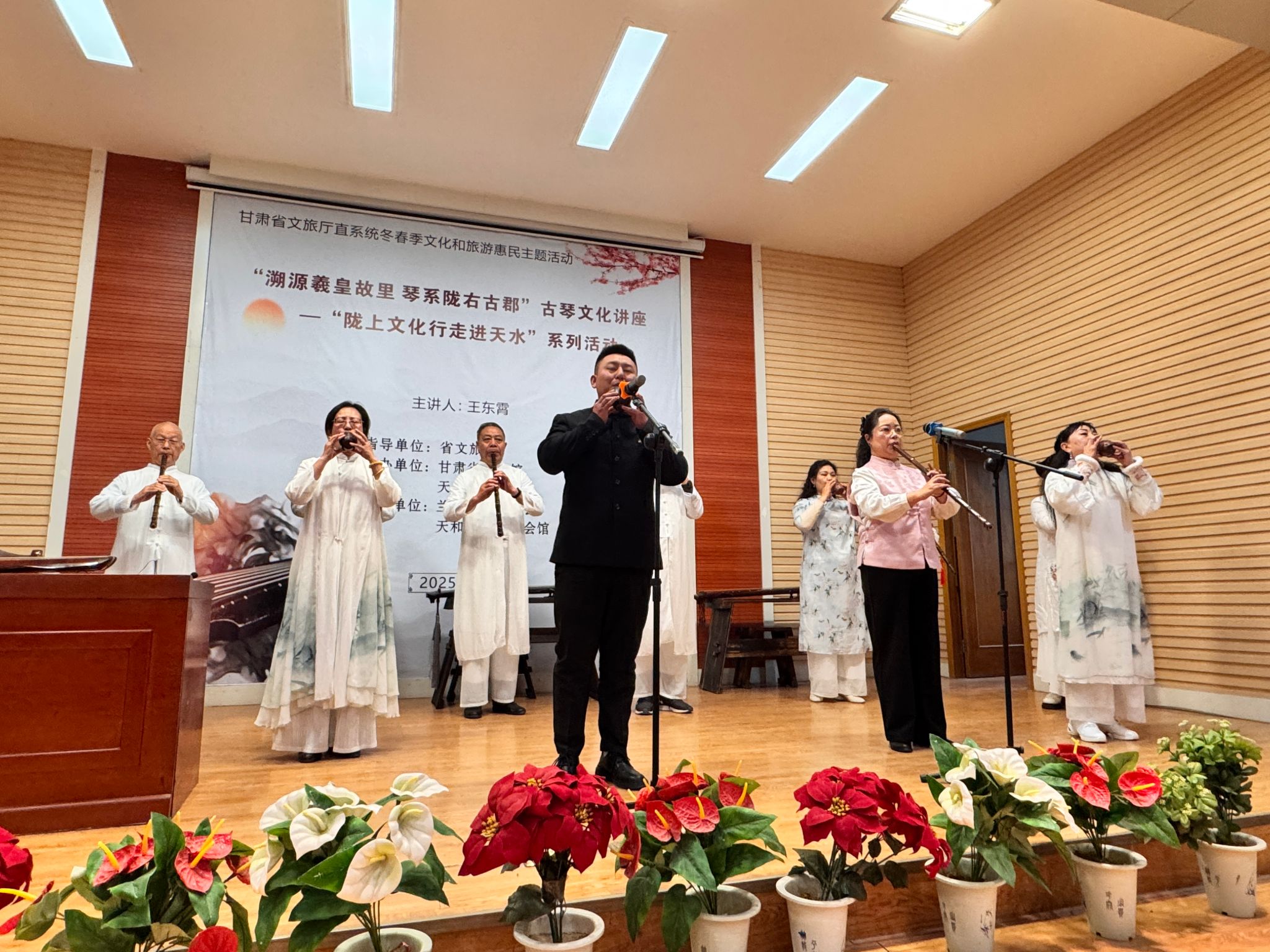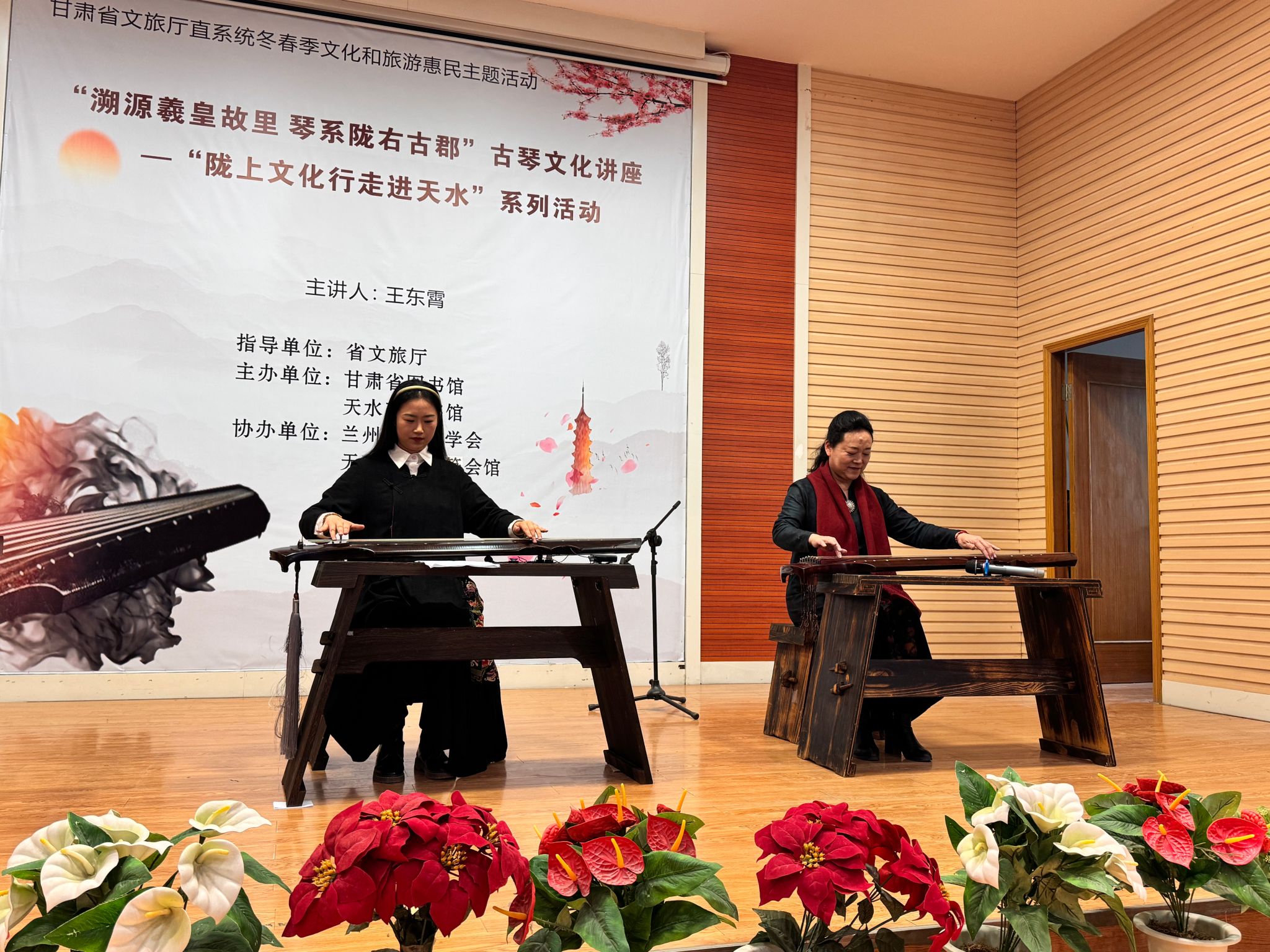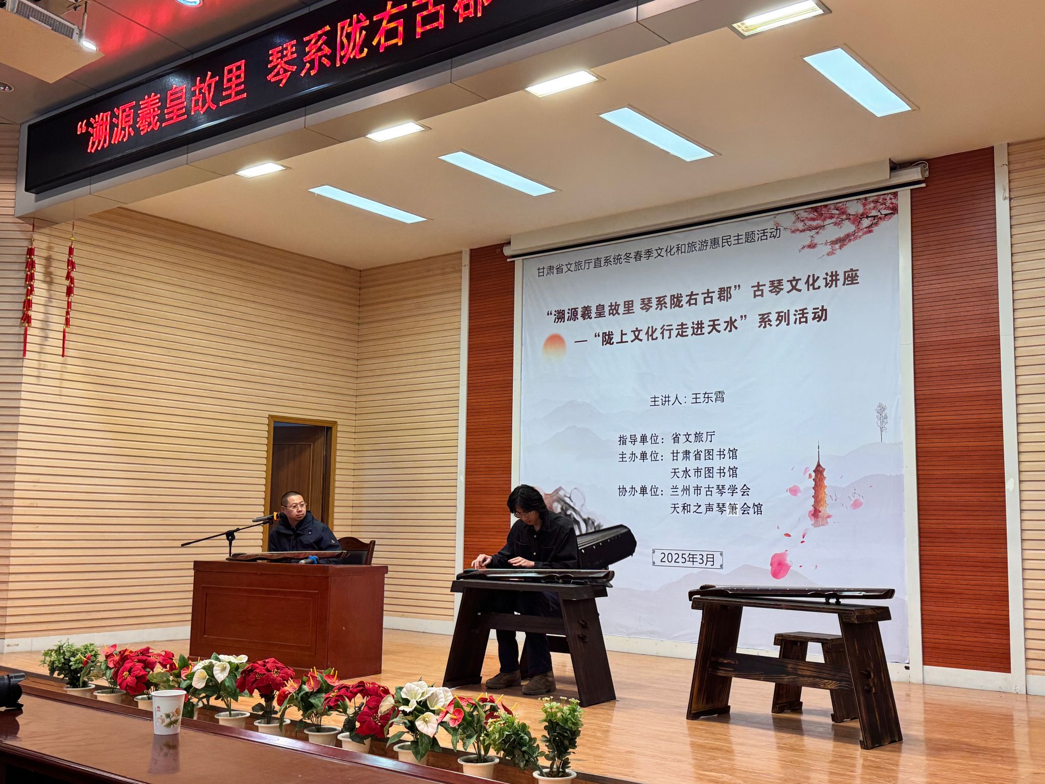 为全面贯彻落实党的二十届三中全会精神,深入学习贯彻习近平文化思想和习近平总书记视察甘肃重要讲话重要指示精神,更好地弘扬甘肃的文化之韵,3月22日下午,由省文旅厅指导、甘肃省图书馆联合天水市图书馆主办、天和之声琴箫会馆协办的“溯源羲皇故里 琴系陇右古郡”古琴文化讲座在市图书馆报告厅成功举办。兰州市古琴学会副会长、秘书长王东霄先生受邀主讲,活动吸引了200余名观众热情参与。