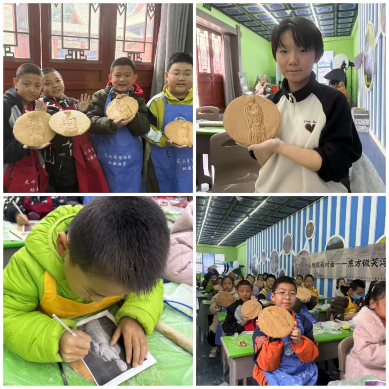 随后,陶泥浮雕制作环节开启。大家手持黏土,指尖触感拉近了与古老艺术的距离。他们凝神思索,“东方微笑”的神韵在脑海中浮现。有的把陶土搓成小块,稳稳按压在底板上,搭建起艺术的雏形;有的则手持雕刻工具,仔细雕琢微笑轮廓,每一次刮擦都似跨越时空与古代工匠对话。最终,一件件饱含创意的“东方微笑”浮雕作品诞生。有的细腻展现微笑的温柔,有的大气诠释微笑的深邃,还有的融入童趣,赋予古老文化符号全新理解。每一件作品都承载着大家对麦积山石窟文化的热爱,彰显传承民族精神的担当。