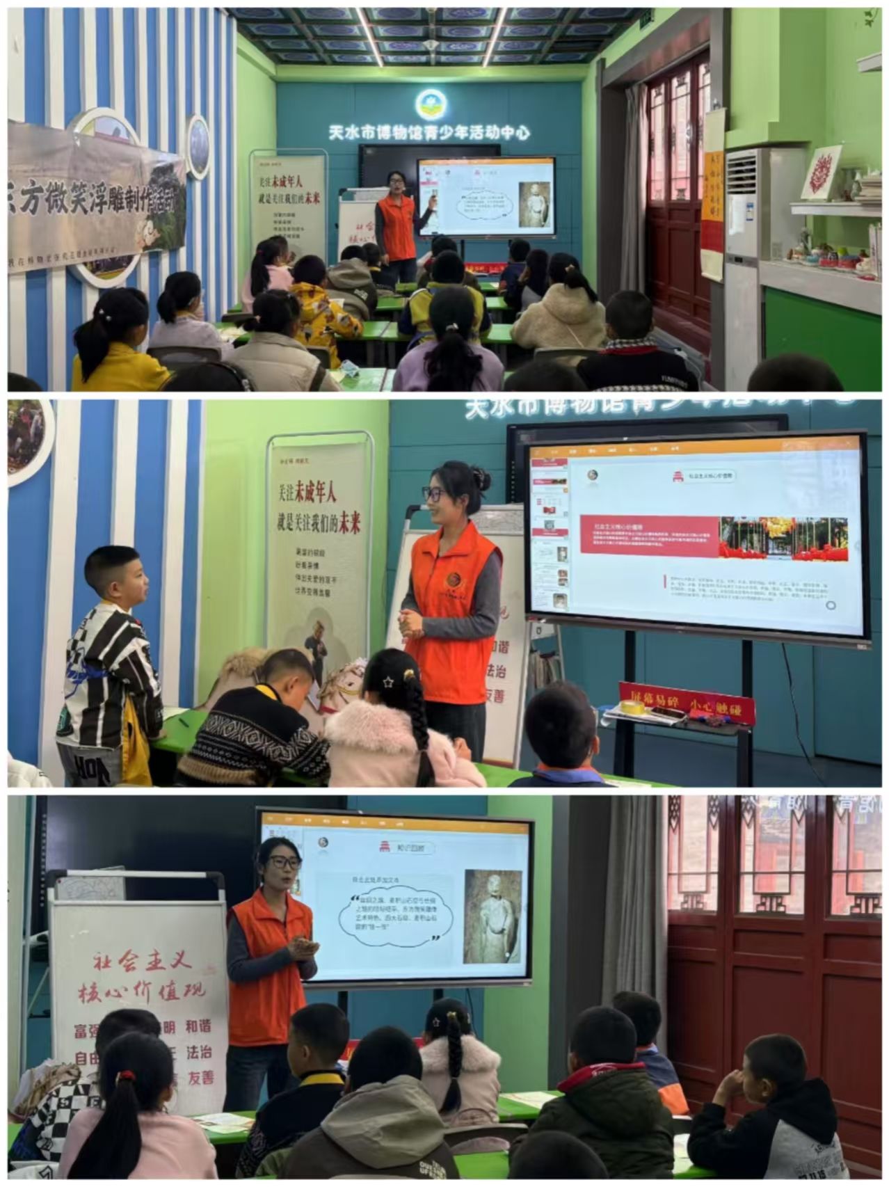活动伊始,宣教员以千年时光为经,艺术流变为纬,在历史长卷中徐徐展开麦积山石窟的造像史诗,以朝代更迭为轴,清晰的讲述了佛造像从北魏清瘦秀骨到北周浑圆饱满,从隋唐丰腴典雅到两宋世俗写实的特点。深入浅出的讲述麦积山石窟自北魏至宋代的发展脉络,探究“东方微笑”的历史意义与现实意义及其背后蕴含的社会审美与工匠精神的传承,为青少年后续的深度学习构筑起完整的认知框架。