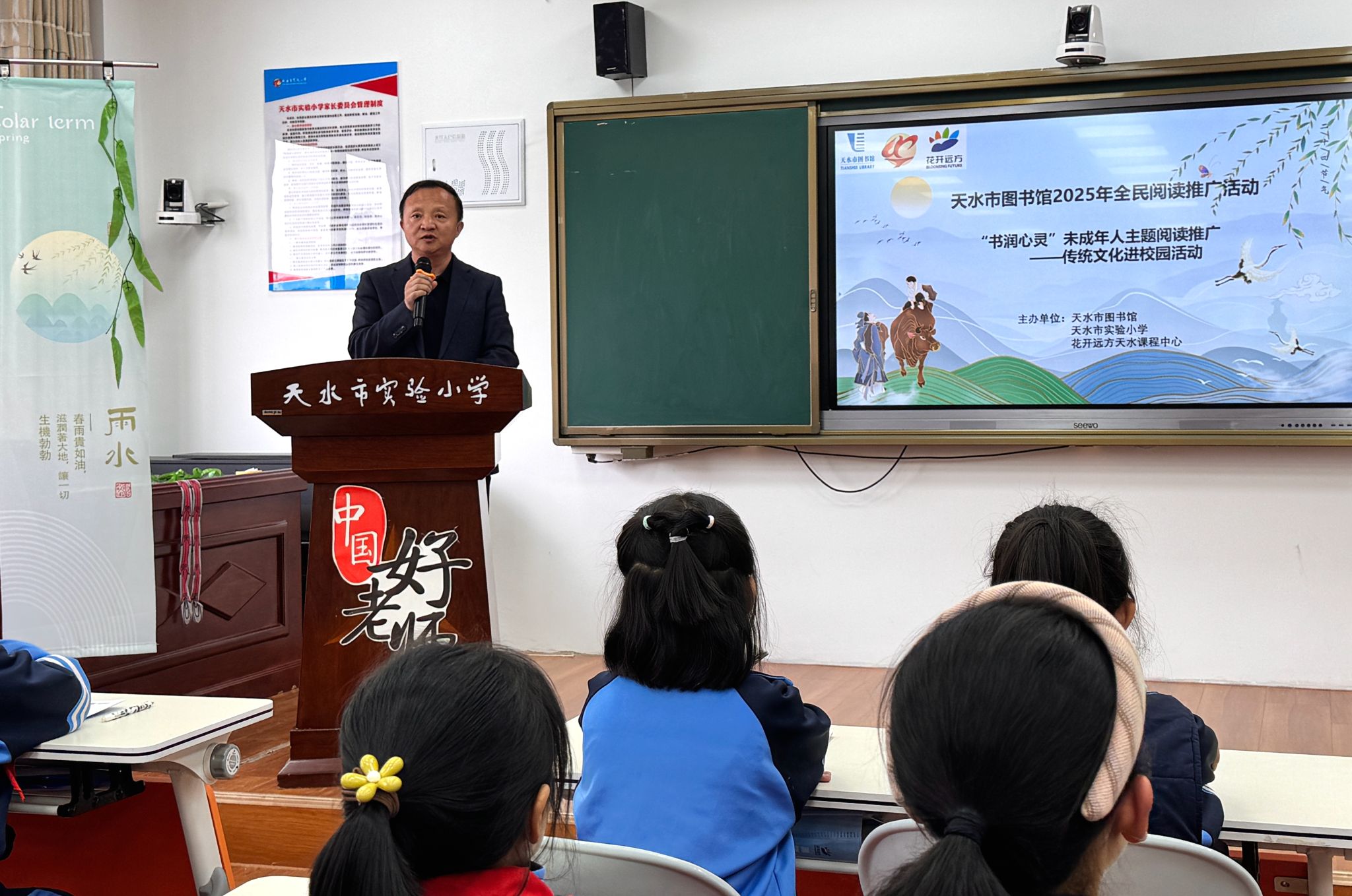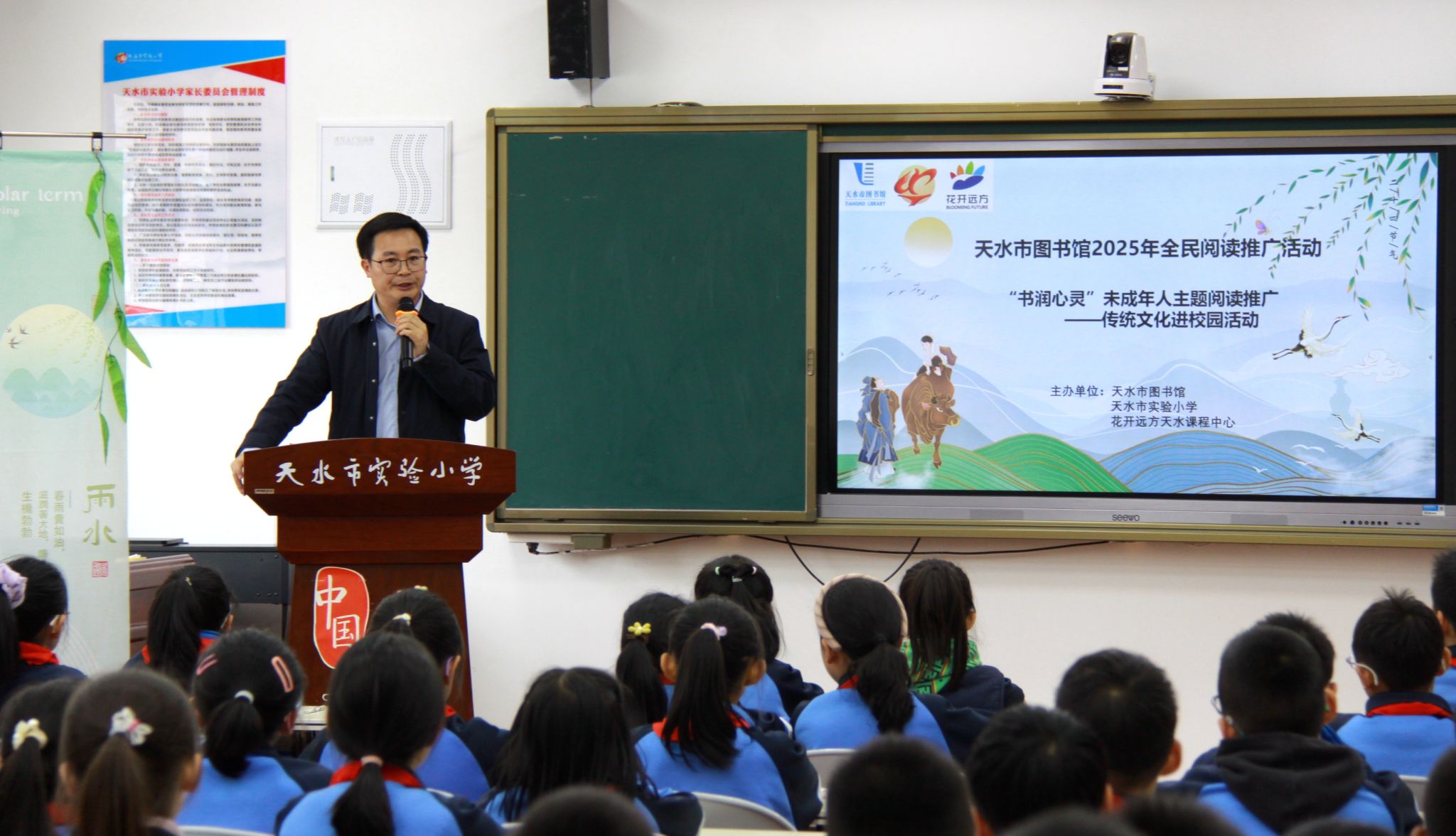 又是一年春草绿,梨花风起清明时。清明节前夕,天水市图书馆携手花开远方天水课程中心,走进市实验小学,举办了以“清明寻根 传承匠心”为主题的2025全民阅读推广进校园活动。活动持续3天时间,以现场授课、市图书馆公众号、抖音平台直播的方式进行,实验小学三年级全体师生及线上参与者共计600余人。