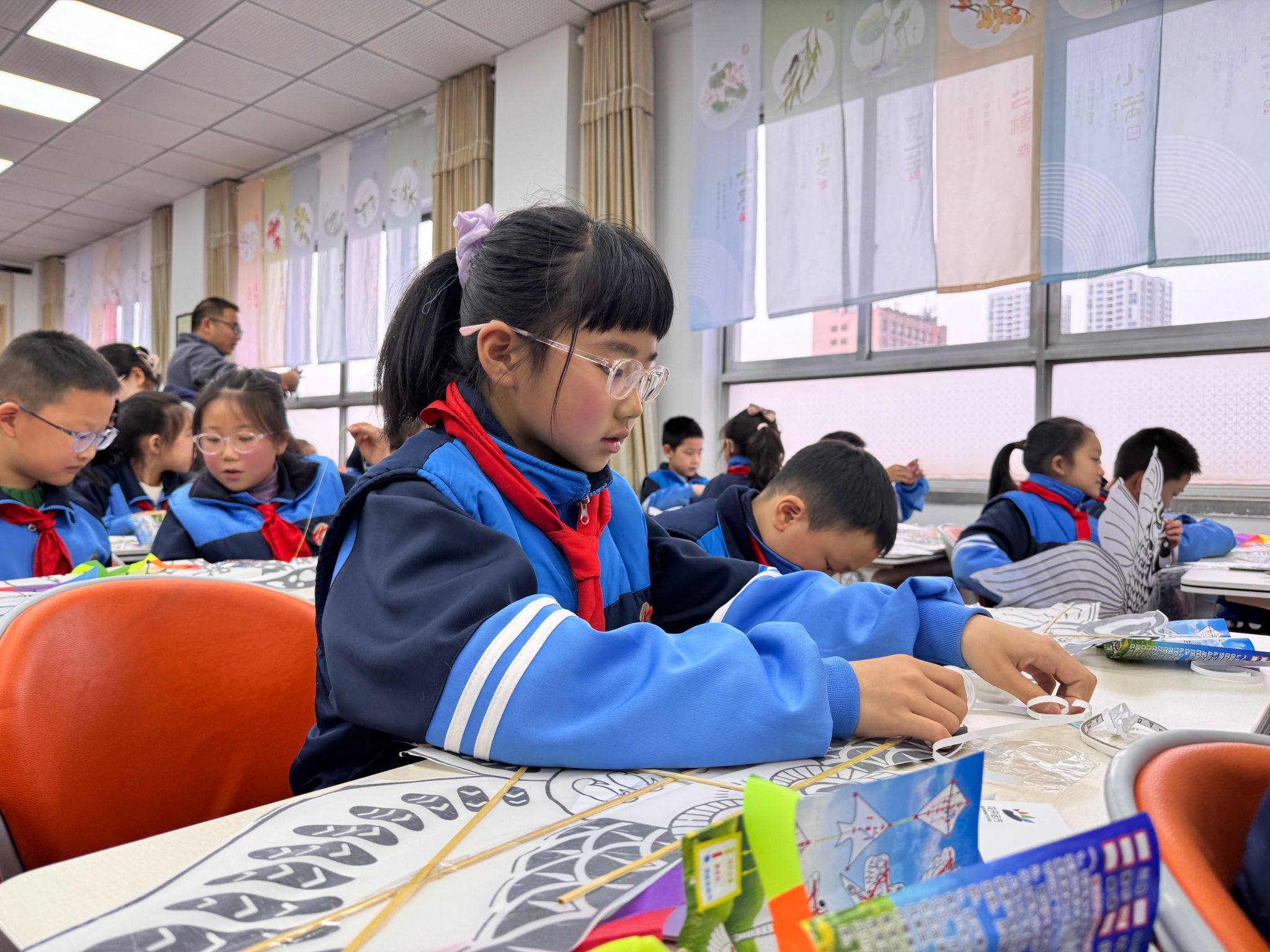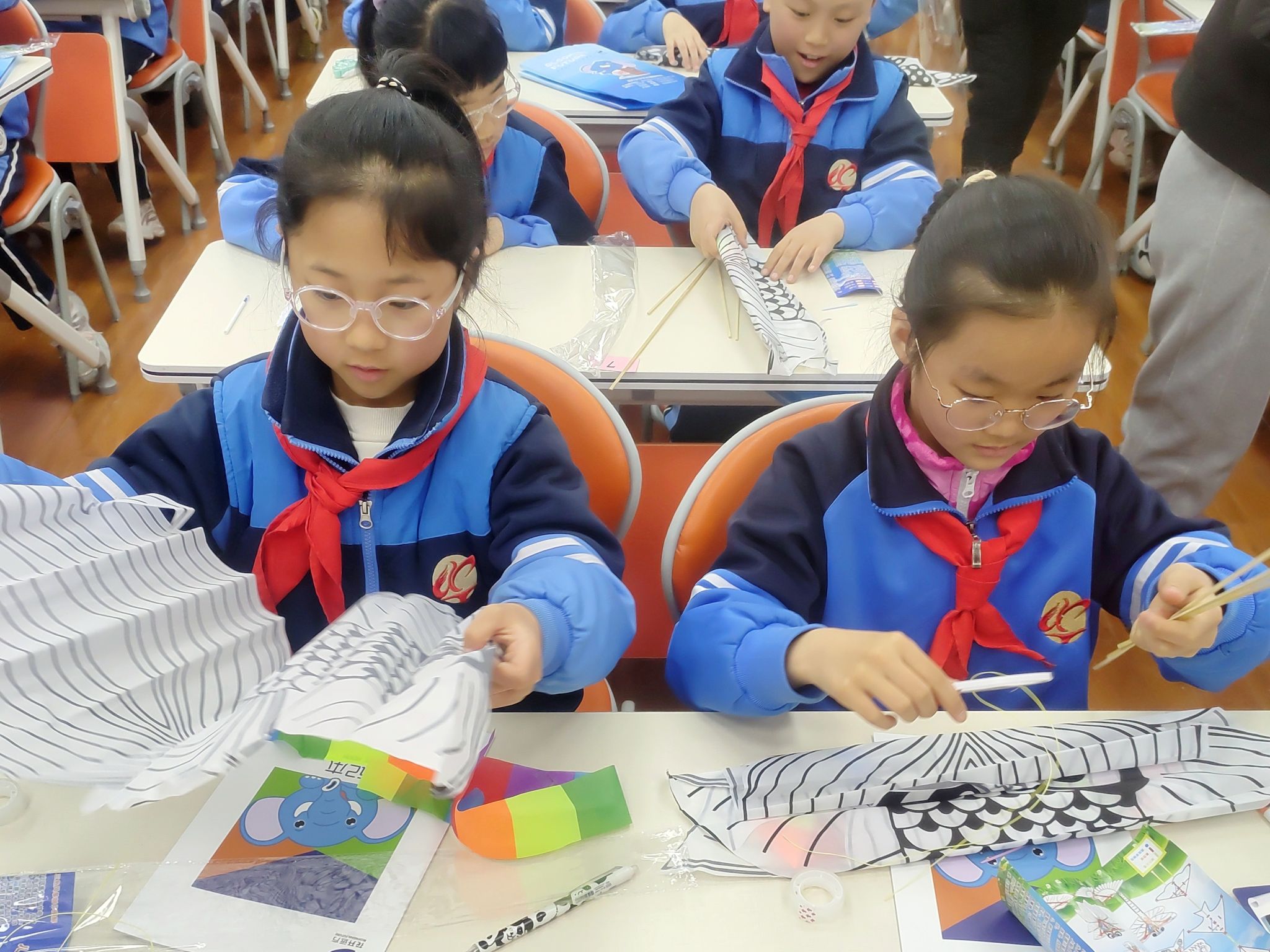 为了让同学们更深入地感受清明传统习俗,课堂尾声还进行了风筝手工制作活动,孩子们用稚嫩的小手认真地裁剪、粘贴、绘画,每一个动作都充满了童真与专注。