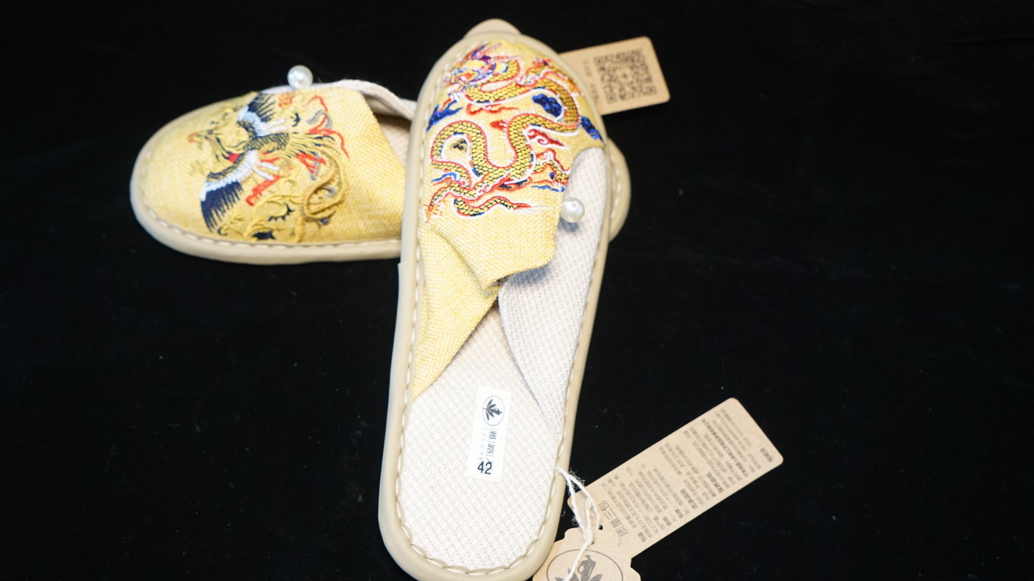 甘谷麻编是甘谷县的传统手工艺品,被列入甘肃省非物质文化遗产名录,产品以天然麻纤维为原料,通过手工编织制成各类生活用品和工艺品,其纤维强韧、透气耐用。作品设计灵感来源于中国传统文化中的龙凤图案,通过刺绣工艺将龙凤形象栩栩如生地呈现在鞋面上,将传统文化元素融入现代鞋履设计中。
