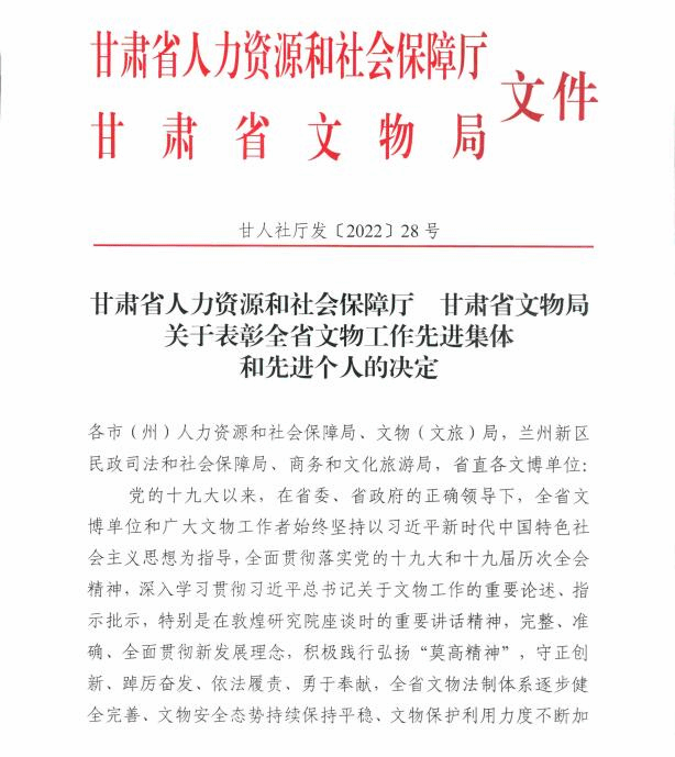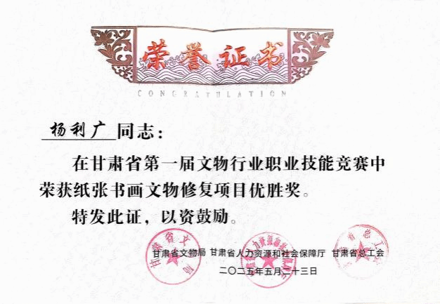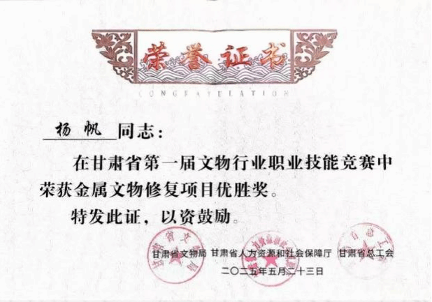 甘肃省第一届文物行业职业技能竞赛金属文物修复项目优胜奖、纸张书画文物修复项目优胜奖