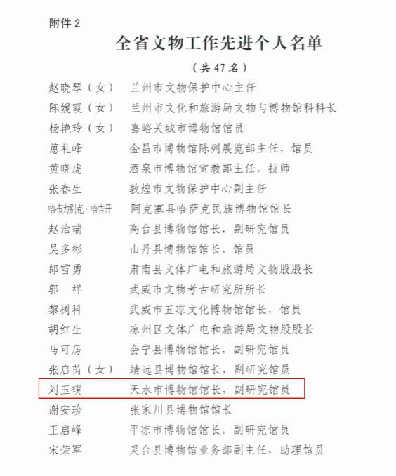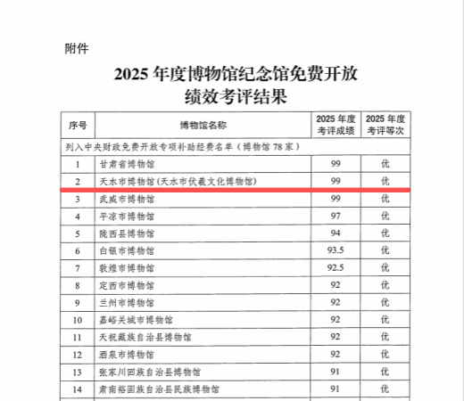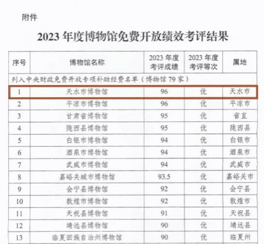 天水市博物馆连续多年在全省博物馆绩效考评工作中获评“优”等次,其中,2023年位列全省第一。