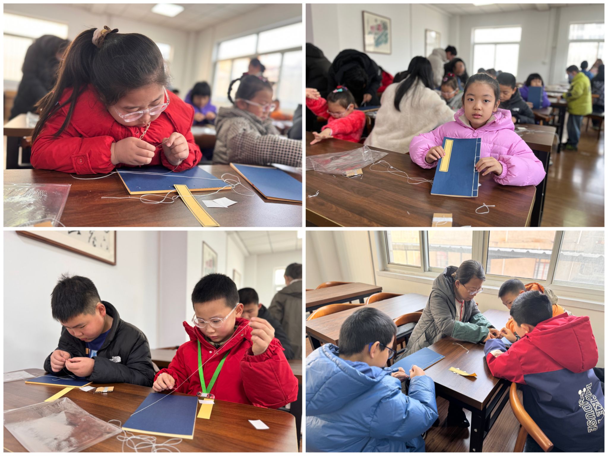 主讲老师首先为大家讲解了中国古代装帧简史的相关内容,重点介绍了古籍装帧形式的演变,并细致讲解了制作线装书的几个重要步骤。孩子们在古籍部工作人员的指导下,积极尝试,自己动手上书皮、穿线、装订、贴签,完成了线装书的装订流程,亲手制作了一本属于自己的线装书。