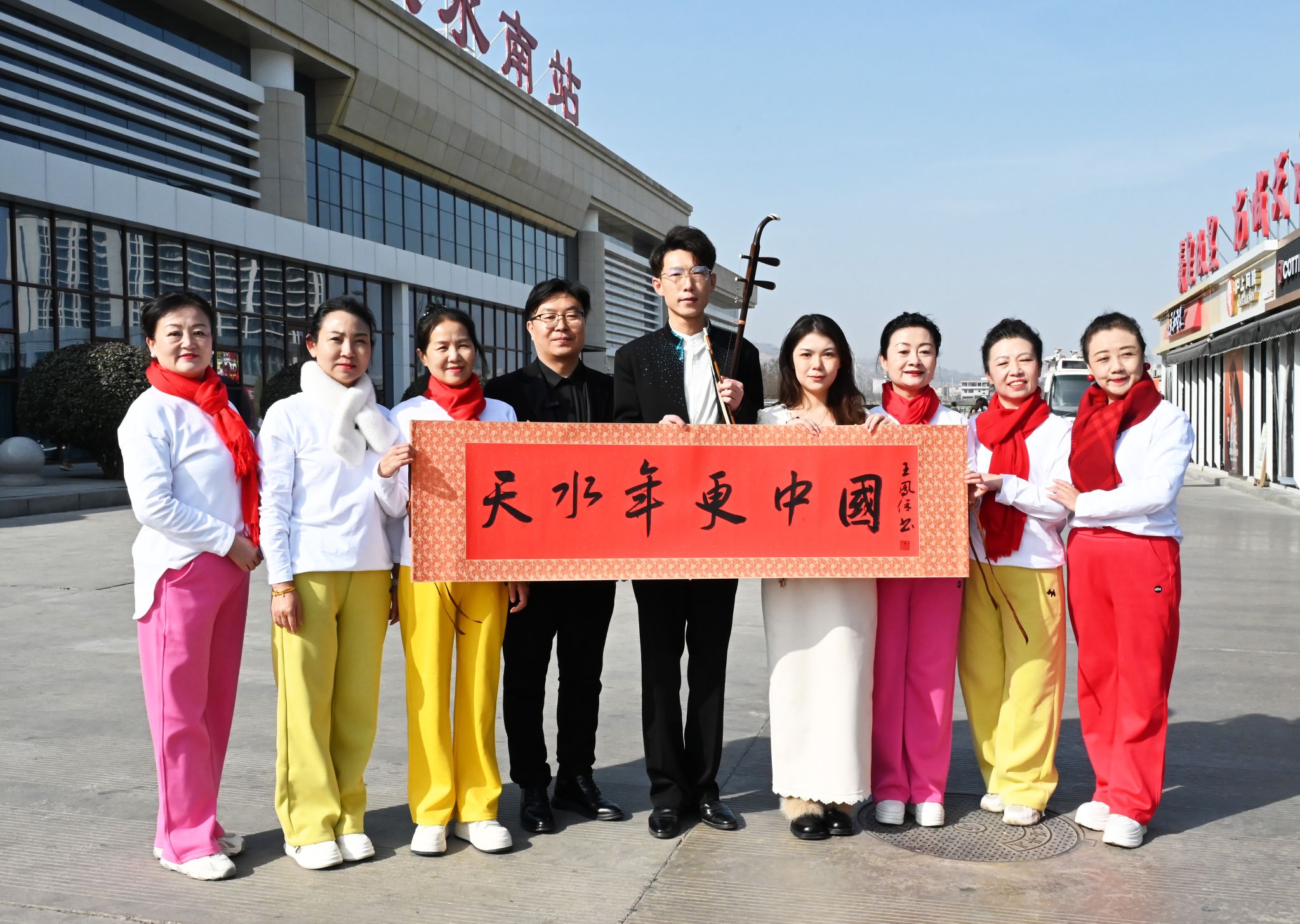 上午十时,南站出站大厅洋溢着喜庆祥和的氛围。随着返乡客流陆续抵站,一场精心筹备的文艺演出在站内拉开帷幕。伴随着激昂欢快的旋律,歌伴舞《好客天水欢迎你》率先唱响,舞者们身着绚丽的节日盛装,以热情洋溢的舞姿向每一位归乡游子张开怀抱;一曲《幸福中国一起走》唱出了家国同庆、共迎新春的深情厚谊,引得过往旅客纷纷驻足;二胡独奏《新赛马》以奔放激昂的弓弦之音,奏出龙马精神的奋进之姿,仿佛在声声召唤游子“策马归故里”,旋律时而铿锵、时而悠扬,令现场观众沉醉其中,掌声不断。