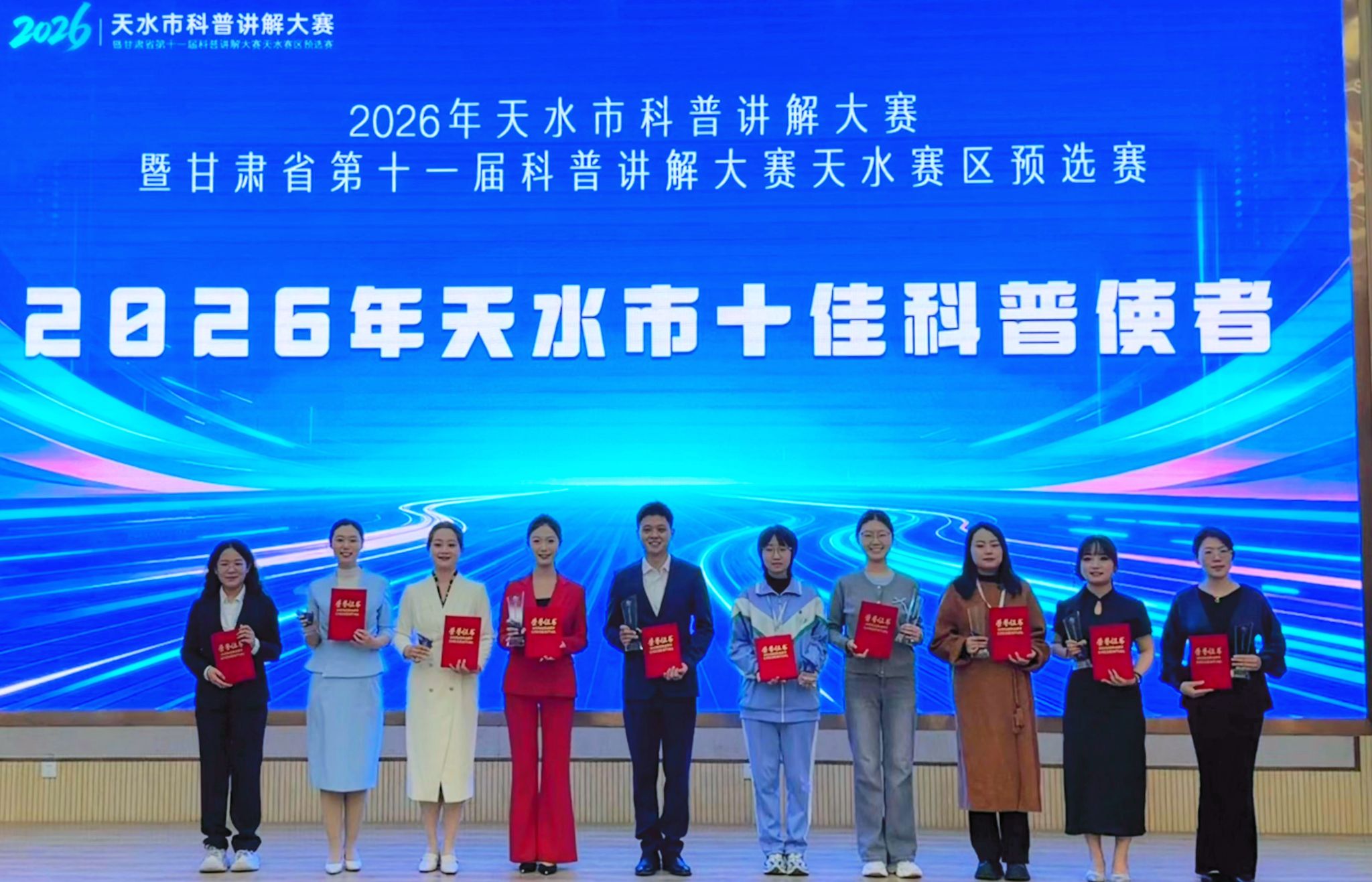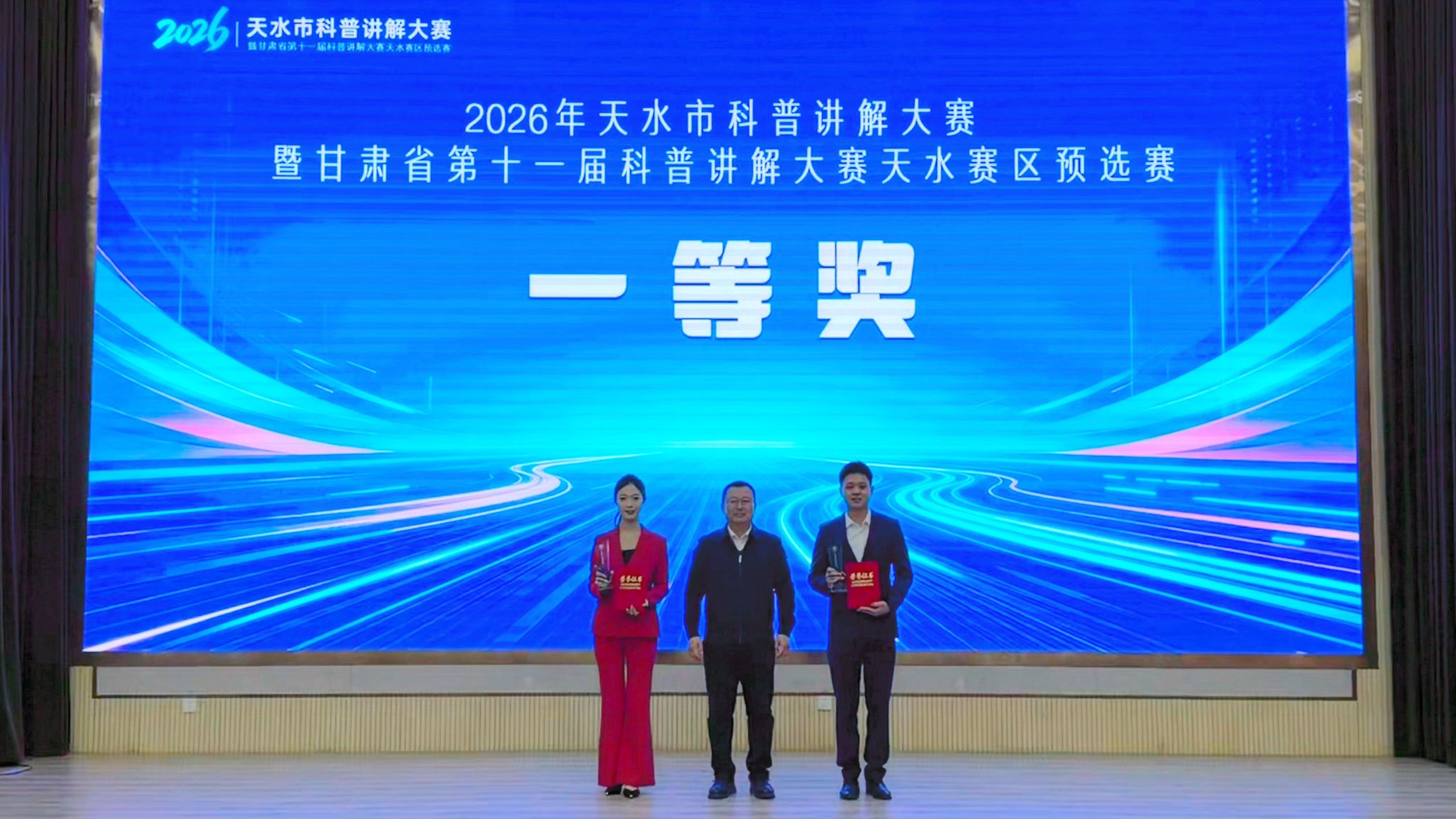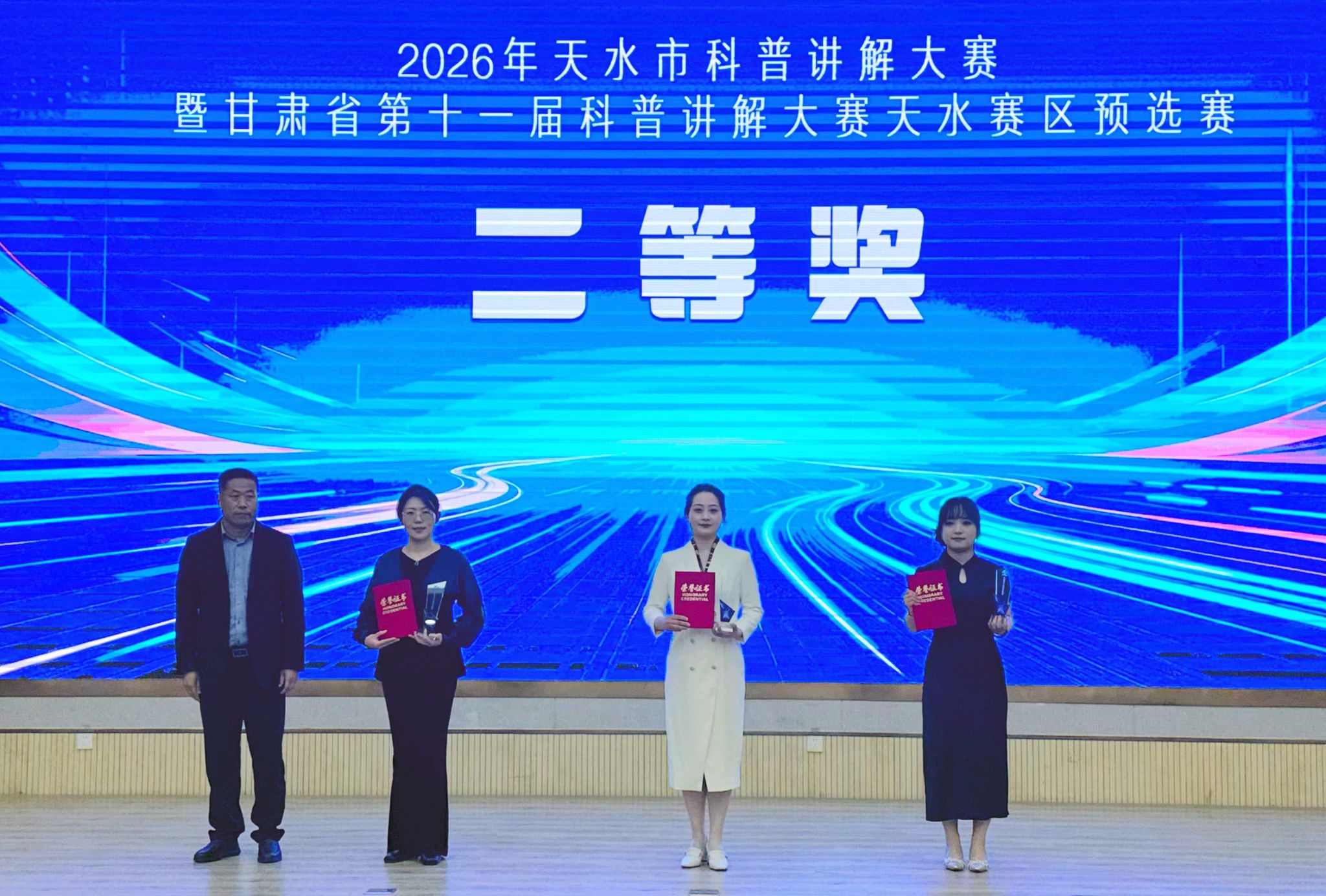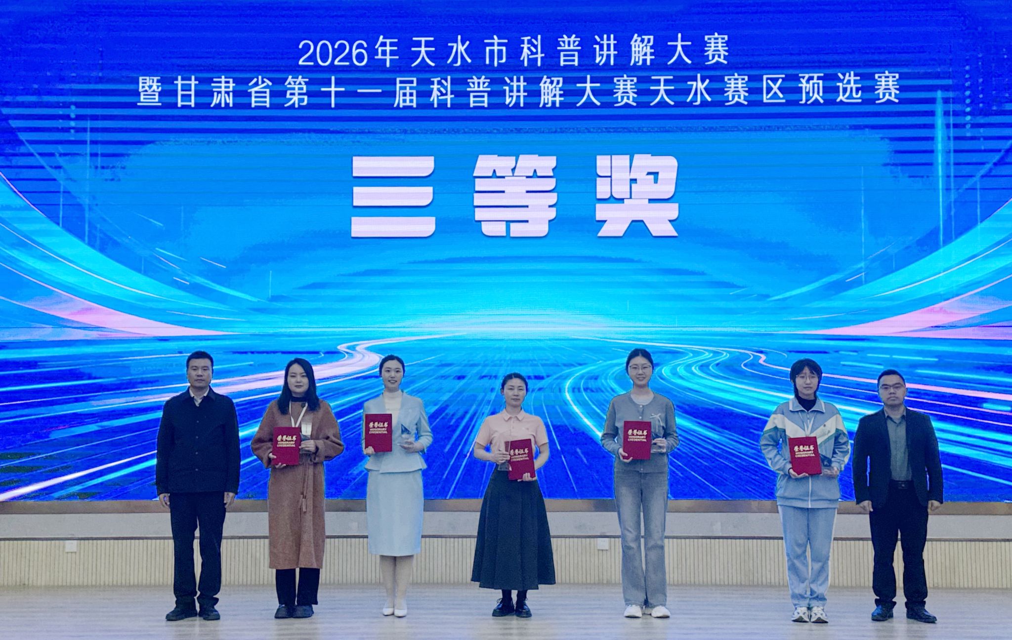 其中,马旻同志凭借出色的现场发挥和深厚的科普素养,荣获大赛一等奖;刘倩玉同志稳扎稳打、表现优异,荣获二等奖;张娅同志从容应战、展现风采,荣获三等奖。三位同志同时荣获“天水市十佳科普讲解使者”称号。