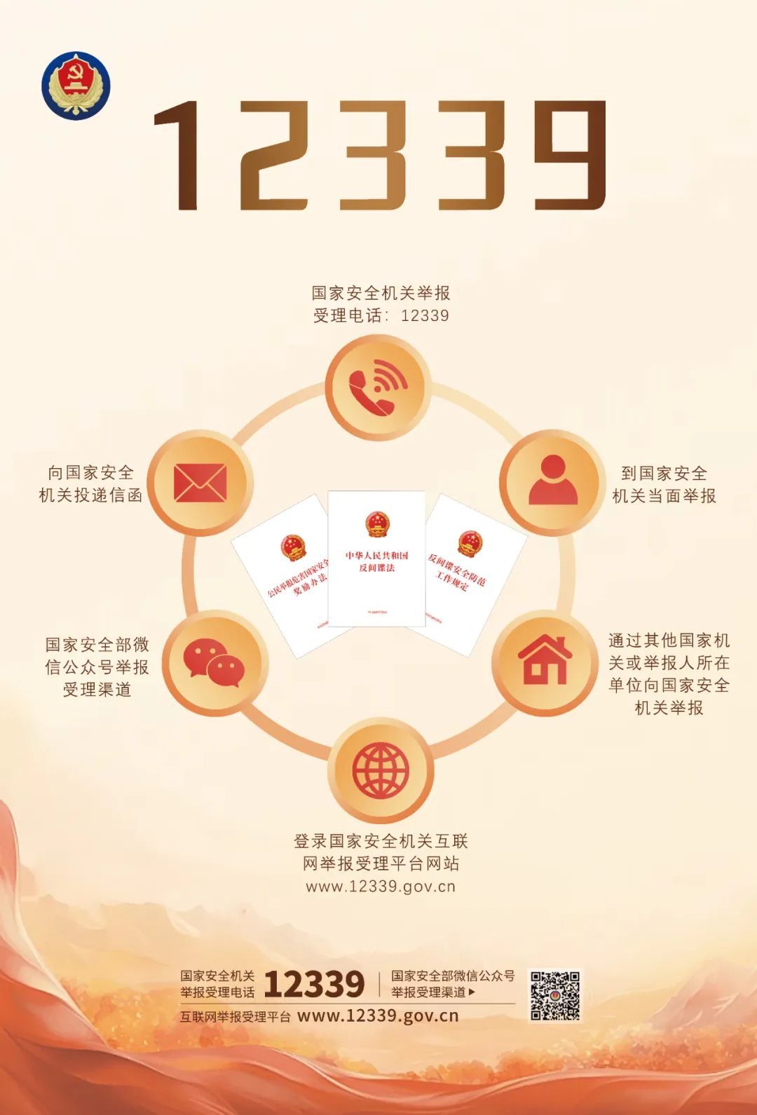 什么是12339?2015年11月,全国国家安全机关向社会发出通告,12339,是受理个人和组织发现的危害中华人民共和国国家安全的情况线索举报电话。