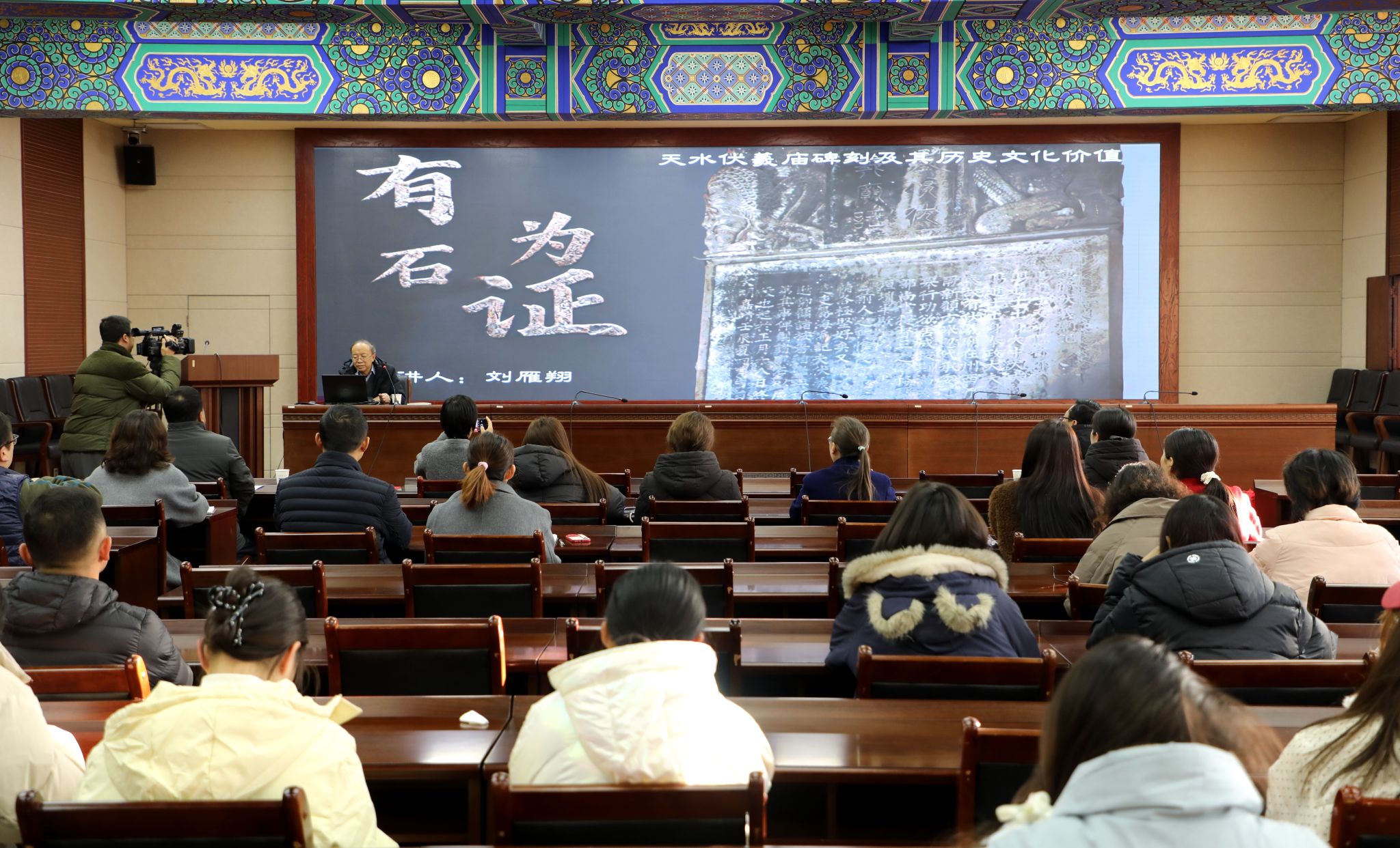 12月3日,天水市博物馆邀请天水师范大学教授刘雁翔作了题为《有石为证——天水伏羲庙碑刻及其历史文化价值》的学术讲座,讲座由天水市博物馆馆长刘玉璞主持,天水行业博物馆同仁、天水市博物馆干部职工、天水师范大学历史文化学院部分师生以及对天水地区石刻文化感兴趣的社会人士80余人聆听了讲座。