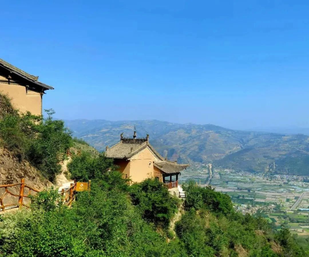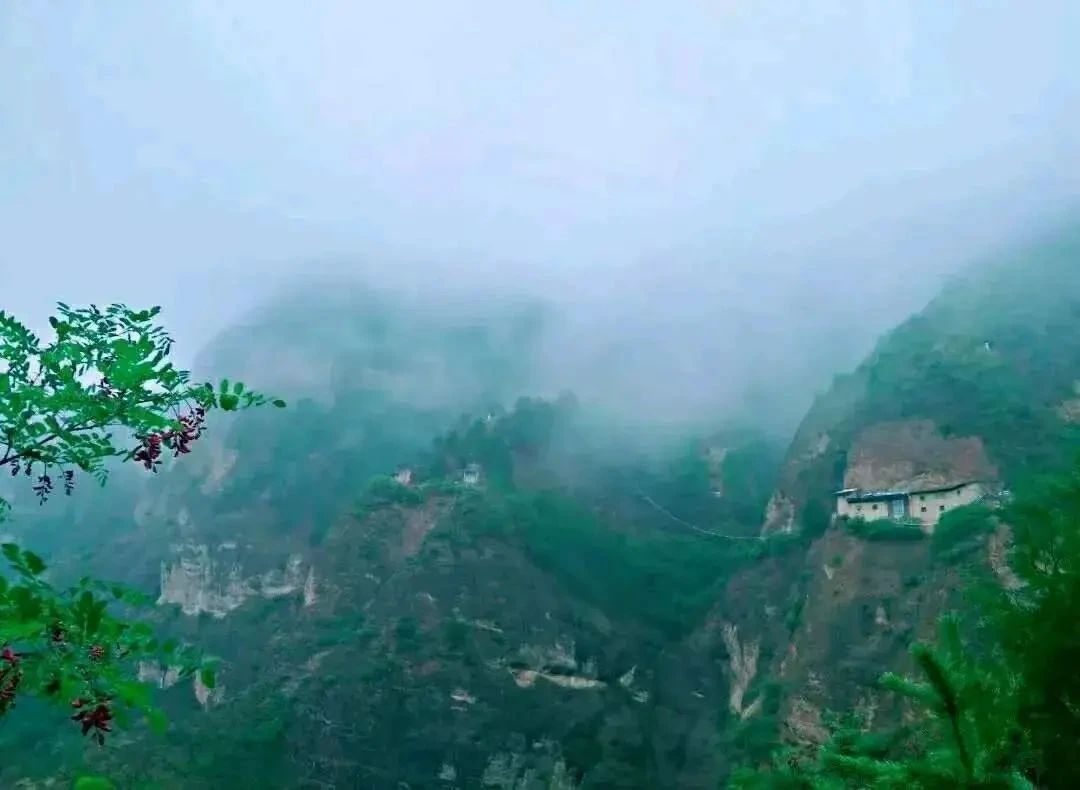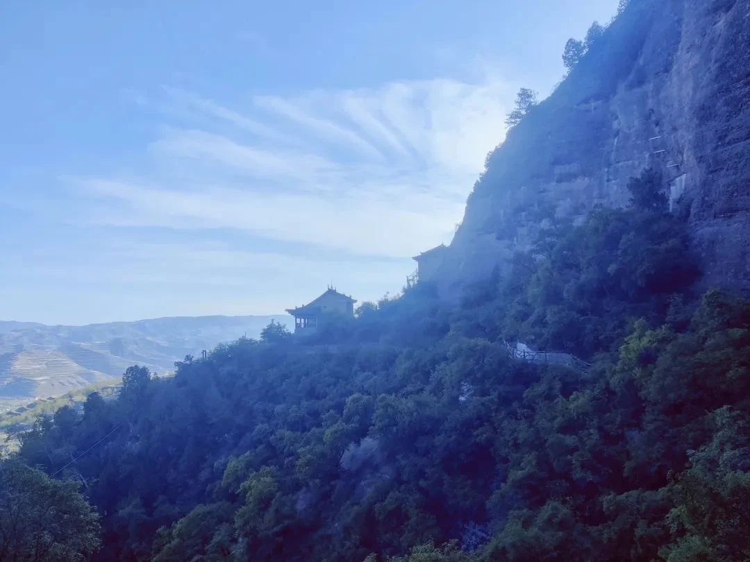 云崖天堑 造化神工 柏林山的褶皱里藏着大地的密码。第三纪沙砾岩在岁月的雕琢下,形成了"华崖峰陡峭凸起,万仞绝壁倚天立"的壮丽奇观。八百四十级石阶如银链垂挂,将人间烟火与峭壁佛国相连。攀援而上,山风裹挟着松涛阵阵,俯瞰脚下,九梁十沟如游龙蜿蜒,绿浪翻涌间,飞檐斗拱若隐若现,恍若仙境。