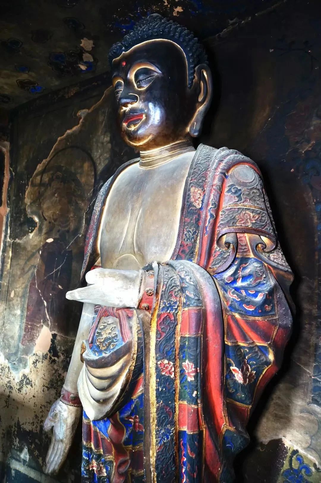壁画在幽暗洞窟中静静绽放。飞天衣袂翩跹,将西域的热烈与中原的含蓄织就成流动的星河;人物画像在矿物颜料的加持下,历经千年依然鲜艳如初。更令人称奇的是佛道文化的交融共生——石窟群中既有晚唐时期的释迦牟尼像,也有明代的玉皇阁,八仙过海的彩绘与金刚力士的身姿相映成趣,见证着丝绸之路多元文明的碰撞与共生。