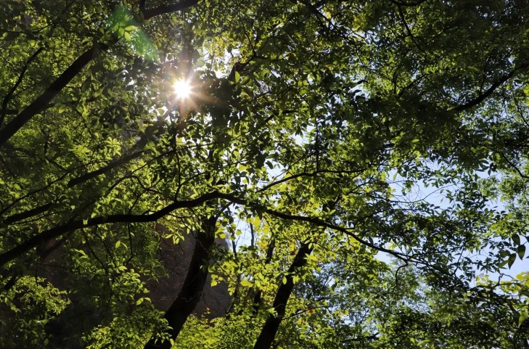 沿山路徐行,闯入眼帘的漫坡白皮松,它们扎根于崖壁缝隙,枝干遒劲如盘龙,松针细密如绿绒,将阳光滤成斑驳的光点,洒在石阶上。山风穿林而过,松涛阵阵,带着草木的清香扑面而来,瞬间吹散周身的热意,只留沁心的凉爽。
