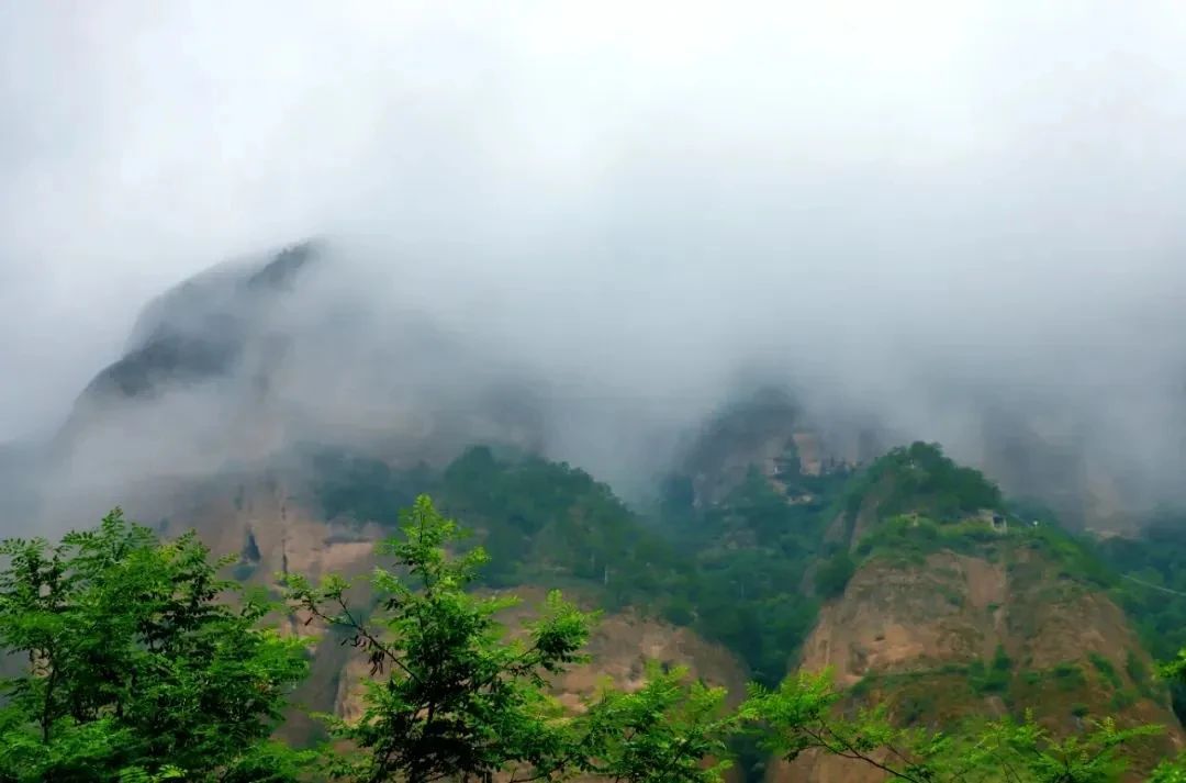 若恰逢微雨,更能遇见木梯石窟最动人的模样。雨丝如牛毛般斜斜飘落,远山近崖都笼在一层薄薄的烟雨里。云雾从山谷间缓缓升起,像流动的轻纱,缠绕着石窟的轮廓,让那些凿刻在崖壁上的佛龛若隐若现,平添了几分缥缈仙气。雨水打湿了白皮松的枝叶,翠色愈发浓艳,水珠顺着松针滴落,叮咚作响,与远处的山涧溪流声相和,谱成一曲自然的乐章。