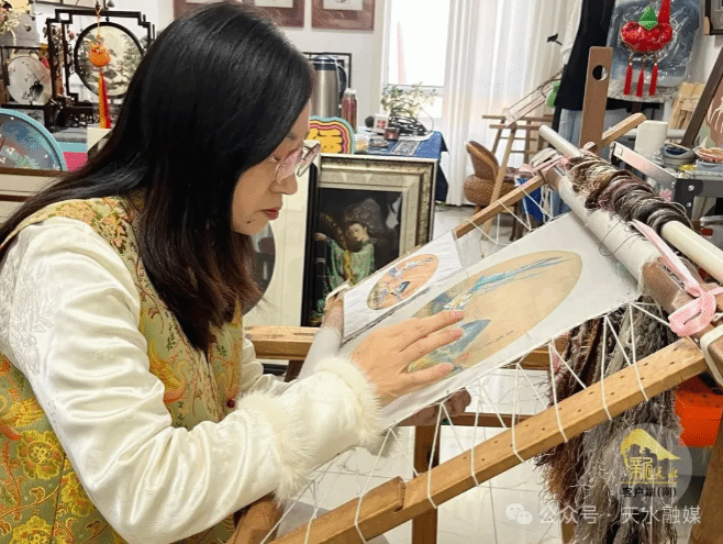 一次偶然的邂逅,让曹苑春坚定了传承刺绣的信念。“那是一幅人物刺绣作品,灵动传神的面容、无痕天成的针脚,令我震撼不已。”曹苑春回忆道。2010年,她进入马跑泉刺绣培训班系统学习。此后十余年间,她足迹遍布全国各地,潜心钻研双面绣、潮绣、贵州苗绣等南北技艺,将14种传统针法烂熟于心,并创造性发展出金线立体钉绣技法,为后续的艺术创新奠定了坚实基础。