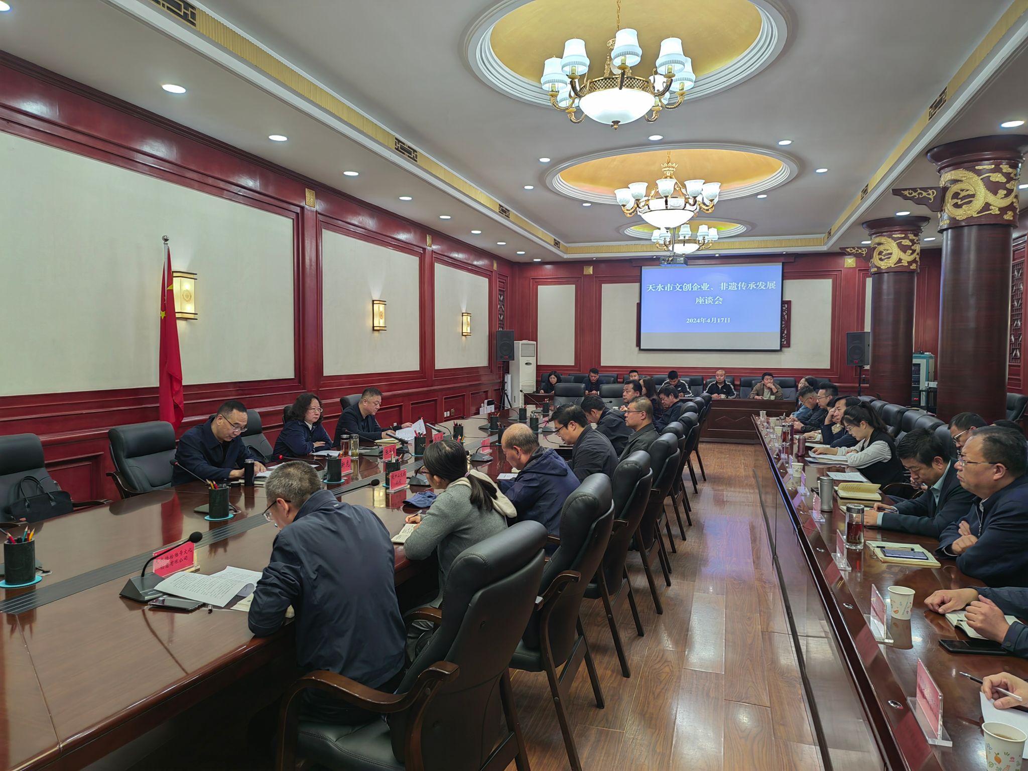 会上市文化和旅游局介绍了全市文化创意、非遗传承发展基本情况,市博物馆、市文投公司、天之水文化产业开发有限公司等9家企事业单位围绕各自文创发展情况、存在的困难及下一步打算逐一作交流发言,秦安县扇鼓舞以及清水县木人摔跤非遗传承人围绕非遗技艺传承发展进行了发言。