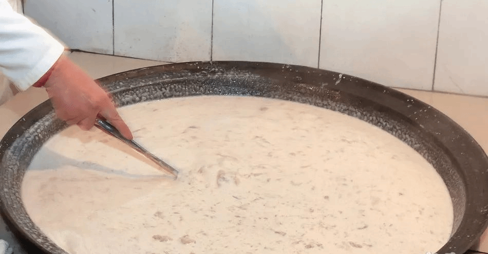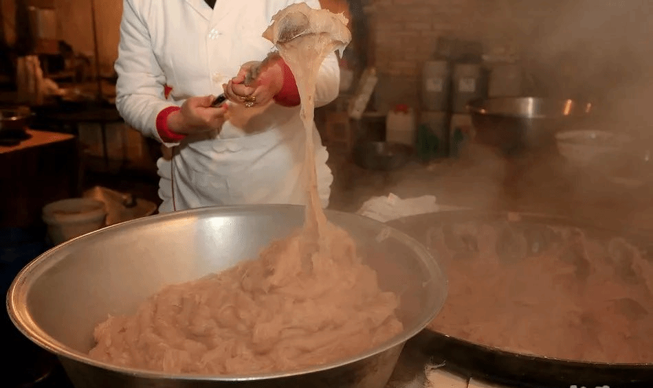 这样一锅呱呱大概要30斤荞麦淀粉,一个小时的时间里,需要不停的搅拌,看似简单的制作流程却需要丰富的经验,还要有过人的臂力。