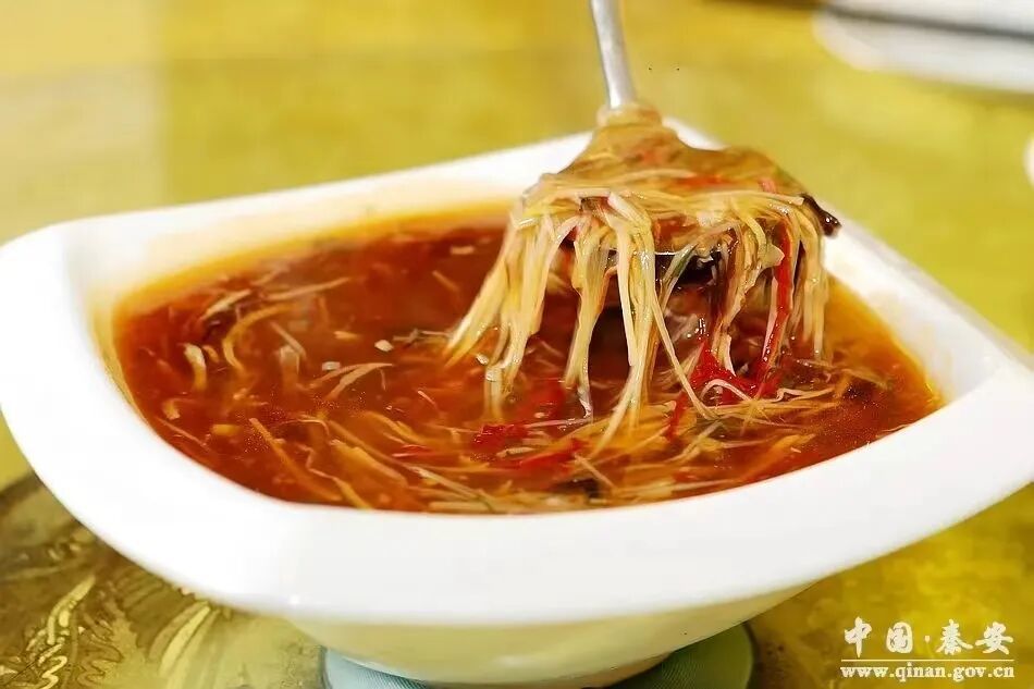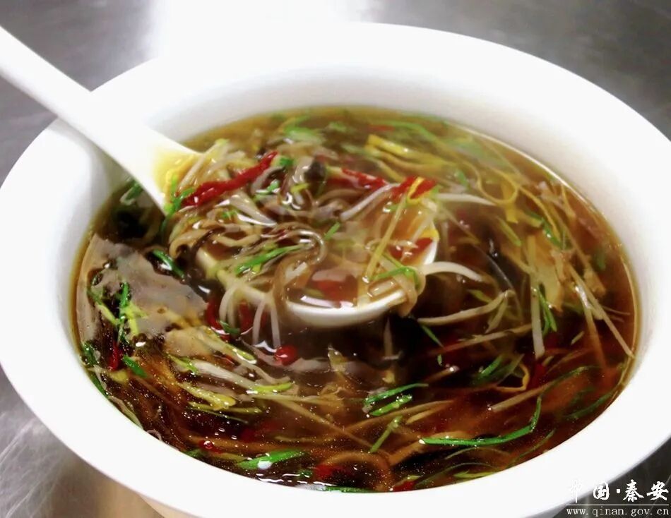 秦安酸辣肚丝汤,是一碗沉淀千年的地道老味道。作为甘肃省级非物质文化遗产美食,这道传承百年的陇上名吃,凭着酸辣开胃的独特口感,征服了一代又一代人的味蕾。以熟肚丝为主料,搭配玉兰笋、线椒、蛋皮等多种食材切丝同煮,酸得柔和、辣得温润,汤汁黄亮浓郁,藏着大地湾先民留下的饮食智慧。每逢佳节或者宴请,它更是秦安人饭桌上的常客,用不变的老味道,续写着代代相传的美食传奇。