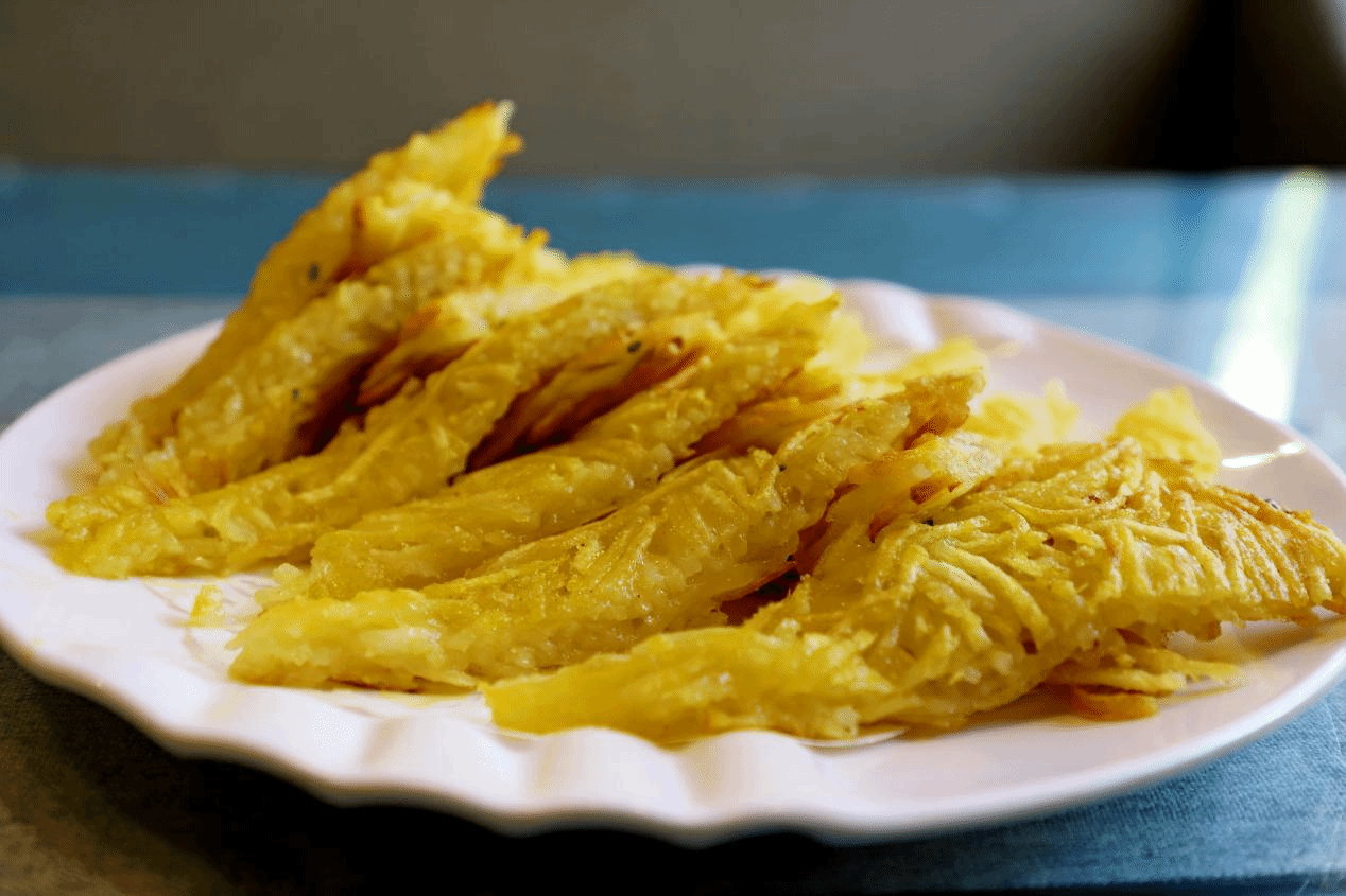 土豆饼:在武山的农家小灶到酒店大堂,我们都可以品尝到这种软糯可口的美食,武山的土豆饼一般是将去皮洗干净的土豆用擦子擦成条状,然后加入适量花椒粉、盐和葱末,再加入少许土豆淀粉,之后搅拌均匀放入电饼铛中,用铲子压平收拢成形,待一面焦黄后翻过来煎另一面,一张土豆饼大约需5分钟。煎好的土豆饼橙黄鲜亮,香气扑鼻。
