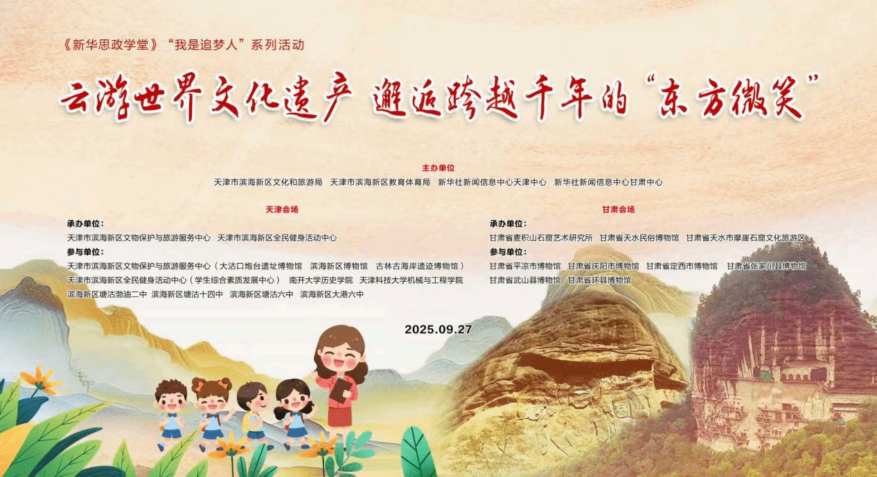 天水民俗博物馆作为国家3A级旅游景区,其社教服务团队始终坚守旅游服务一线,以“东方微笑”为核心,秉持“热情、专业、周到”的服务理念,深耕青少年文旅服务领域。为深入践行总书记重要讲话精神,擦亮天水“东方微笑”旅游服务品牌,展现景区一线服务团队的良好风貌,该团队突破地域与行业界限,牵头联动甘肃、天津两地多馆、多所学校,于2025年9月27日以线上形式成功举办“我是追梦人——云游世界文化遗产 邂逅跨越千年的东方微笑”研学体验活动,打造了文旅服务与文化传播深度融合的创新实践,用专业服务让“东方微笑”的温度跨越千里山海。