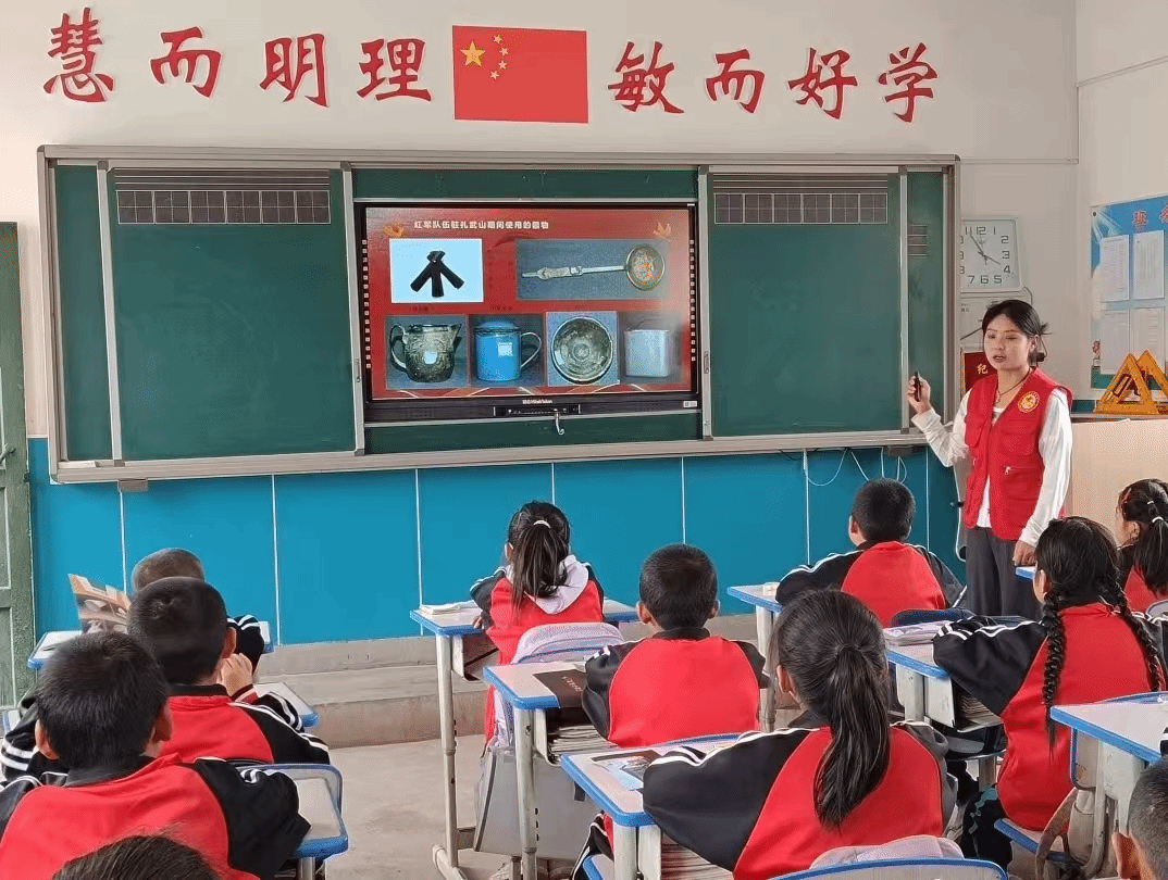 武山县博物馆宣教团队结合乡村小学生的认知特点,精心制作红色历史故事主题课件以及视频资料,通过“图文展示+互动讲解”的形式,为同学们带来了一堂别开生面的文化课堂。讲解员们化身“红色使者”,面带亲切微笑,深情讲述红军三大主力过境武山的革命故事。红军遗留的文物、老红军的口述视频,让同学们直观领略红色历史的厚重,课本上的文字仿佛有了生命,在鲜活的场景中读懂革命先辈的热血与担当,红色种子悄然在心中扎根。活动现场,工作人员还为同学们准备了宣传折页,让孩子们在欢声笑语中领略中华优秀传统文化的魅力。
