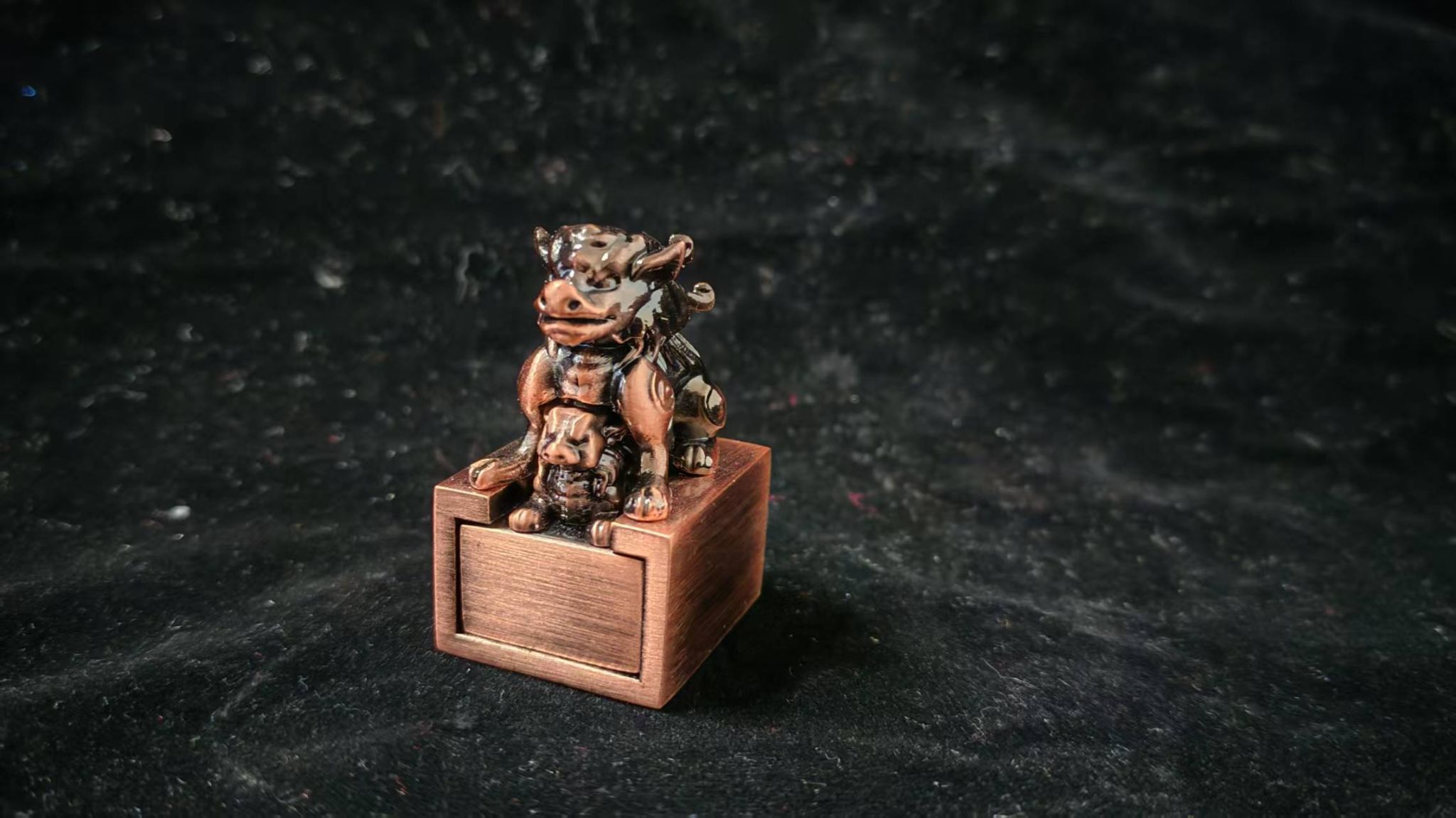 作品取材于甘谷县博物馆馆藏文物“瑞兽钮子母印”。由“母印”与“子印”两枚组成,母印为腹空纳子印,子印可嵌套于母印内部,母抱子状,形成组合式印章。印纽取材敦煌四大神兽“守宝龙”形象,有赐福和守护的寓意,瑞兽造型生动,细节刻画细腻。