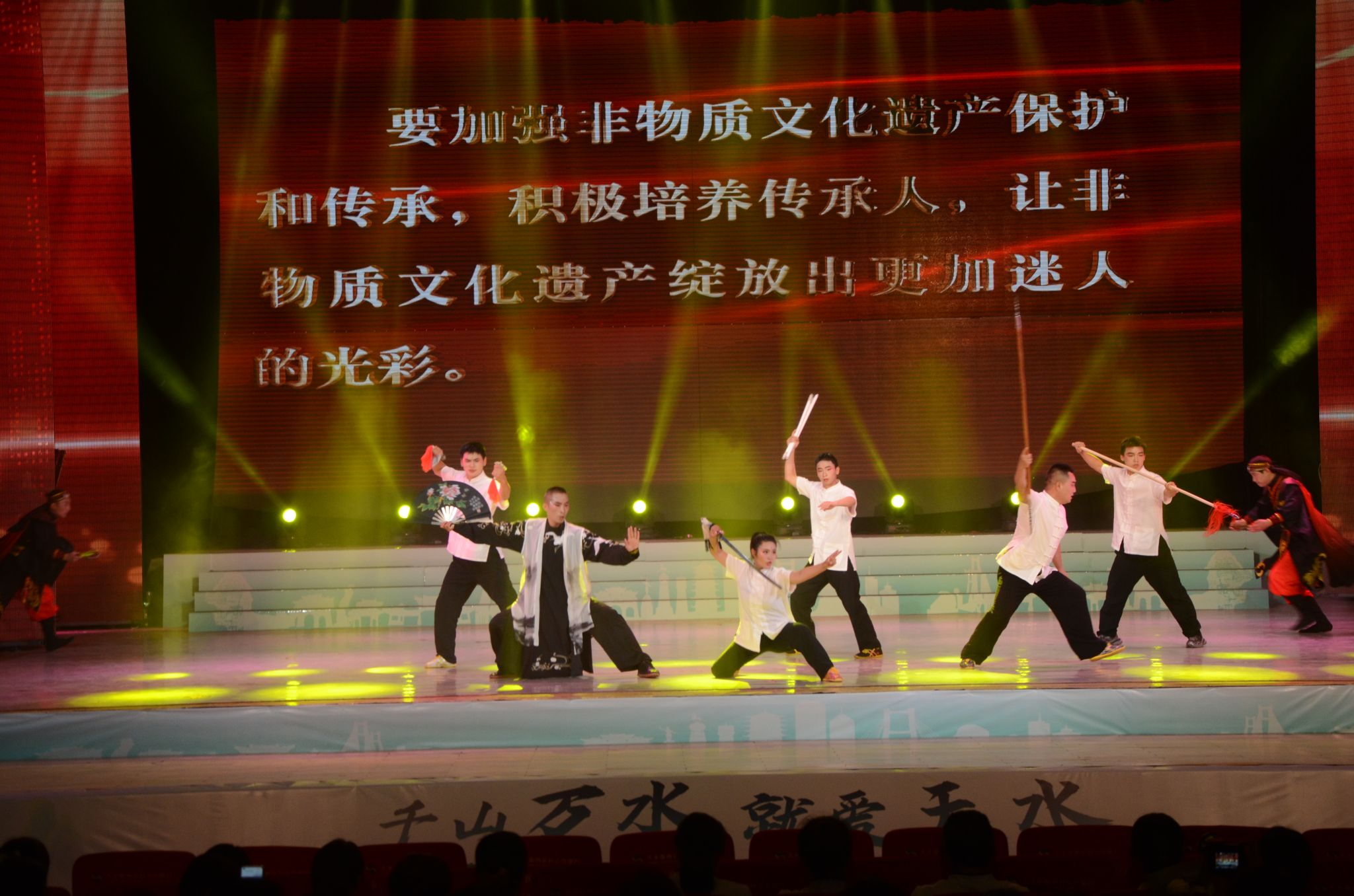 文艺展演中非遗传承人尽显绝活,天水剪纸、雕漆、泥塑、刺绣制作技艺传承人现场创作展示,《清水木人摔跤》将摔跤演绎得惟妙惟肖、神态百出,《渭川武魂》《秦州夹板舞》刚劲有力、粗犷豪放,秦州唢呐、秦安小曲、张川花儿浓缩文化传承,彰显一方民俗风情。《飘彩》尽显秦腔魅力和戏曲绝活,歌舞《东方微笑》《麻辣天水》《美丽天水》等唱出了天水人的自豪和对家乡的热爱,《舞动新时代》《阔步新时代》舞出了新征程上的意气奋发和文化自信,为广大观众呈上一道视觉盛宴、文化大餐,为天水旅游增添了无穷色彩。活动现场还举办了2024年天水市文创产品和旅游商品展示展销活动,吸引游人驻足品评,慷慨解囊。