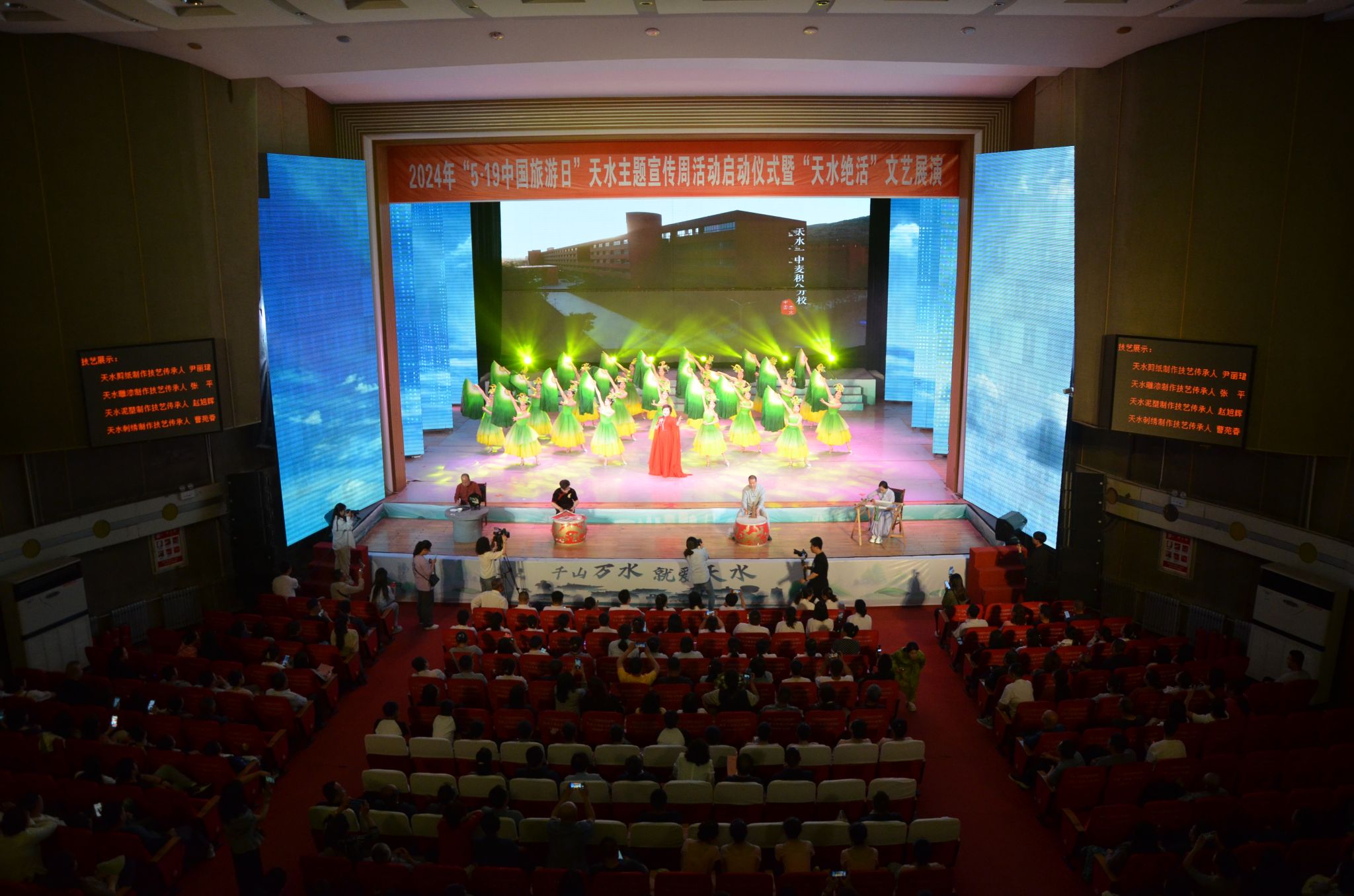 5月13日下午,2024年“5·19中国旅游日”天水主题宣传周活动启动仪式暨“天水绝活”文艺展演在秦州大剧院举办。省文化和旅游厅党组成员、副厅长吕兴来,市委常委、副市长张宇晶,市人大常委会副主任沈建玲,市政协副主席吴立新出席活动,并分别为天水文旅推介官颁发聘书。表彰了李斌等20名天水优秀导游员、讲解员,以及天水市星级饭店从业人员服务技能竞赛获奖选手和单位。此次活动由中共天水市委宣传部、天水市文化和旅游局、天水市委网信办、天水市融媒体中心主办,全市文旅行业、宣传部门、融媒体机构、网红达人等各界代表400余人参加。