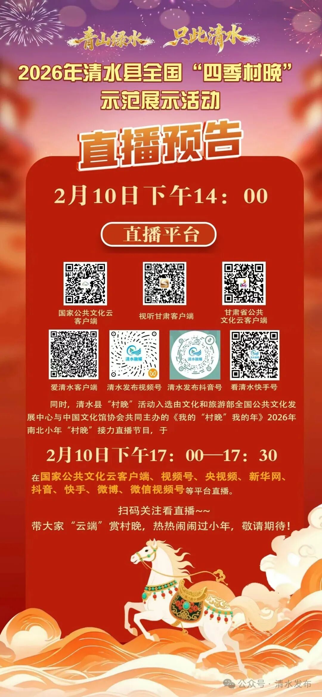 2月10日下午14:00,清水县融媒体中心所属平台爱清水客户端,清水发布视频号、抖音号,看清水快手号全程直播活动盛况,带大家“云端”赏村晚,热热闹闹过小年,敬请期待!