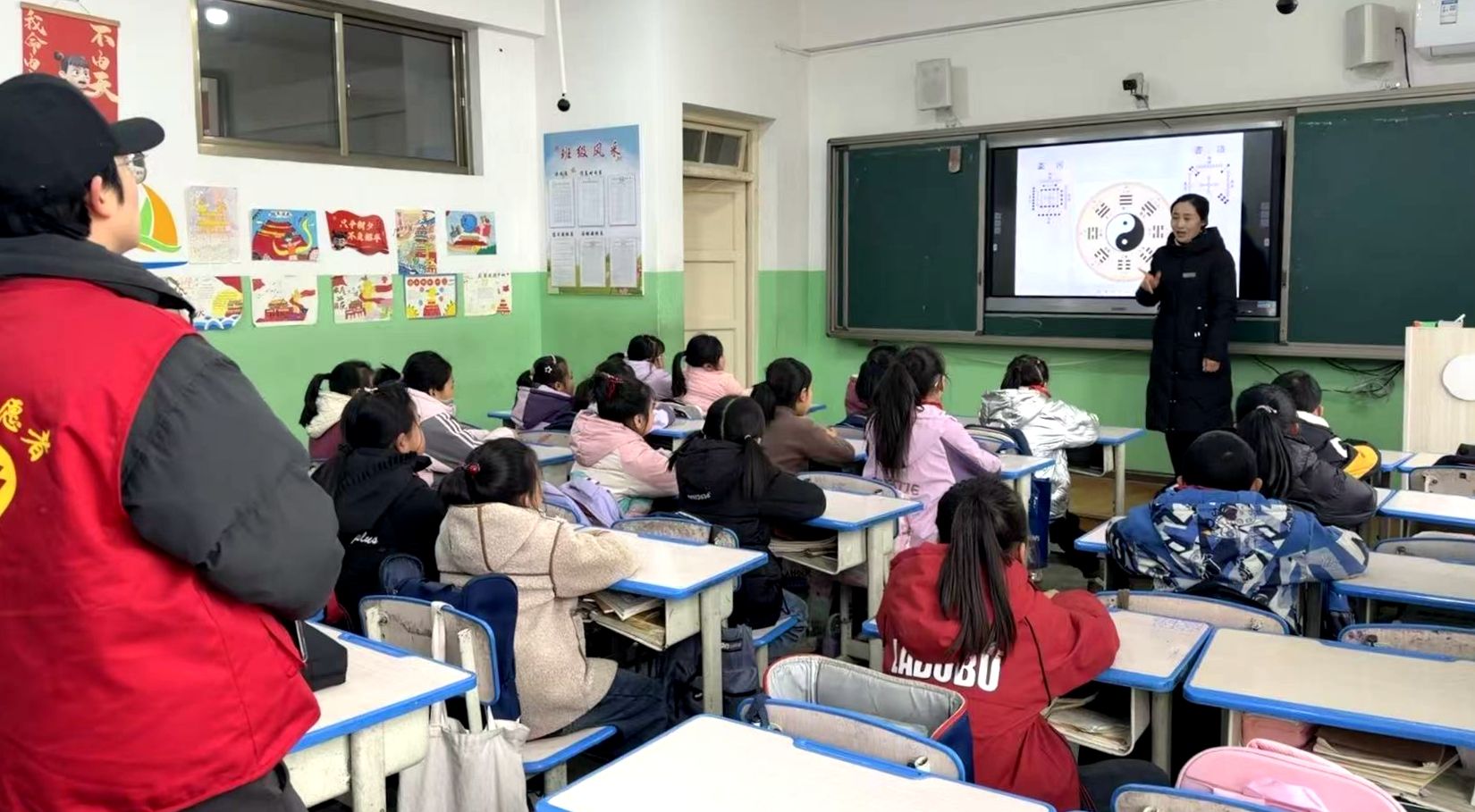 活动当天,博物馆讲解员在校园操场和活动教室,带来了伏羲文化主题展板和多件手工材料,将教室变成了“微型展览”。学生们穿梭其间,直观感受着历史的厚重与文明的传承。