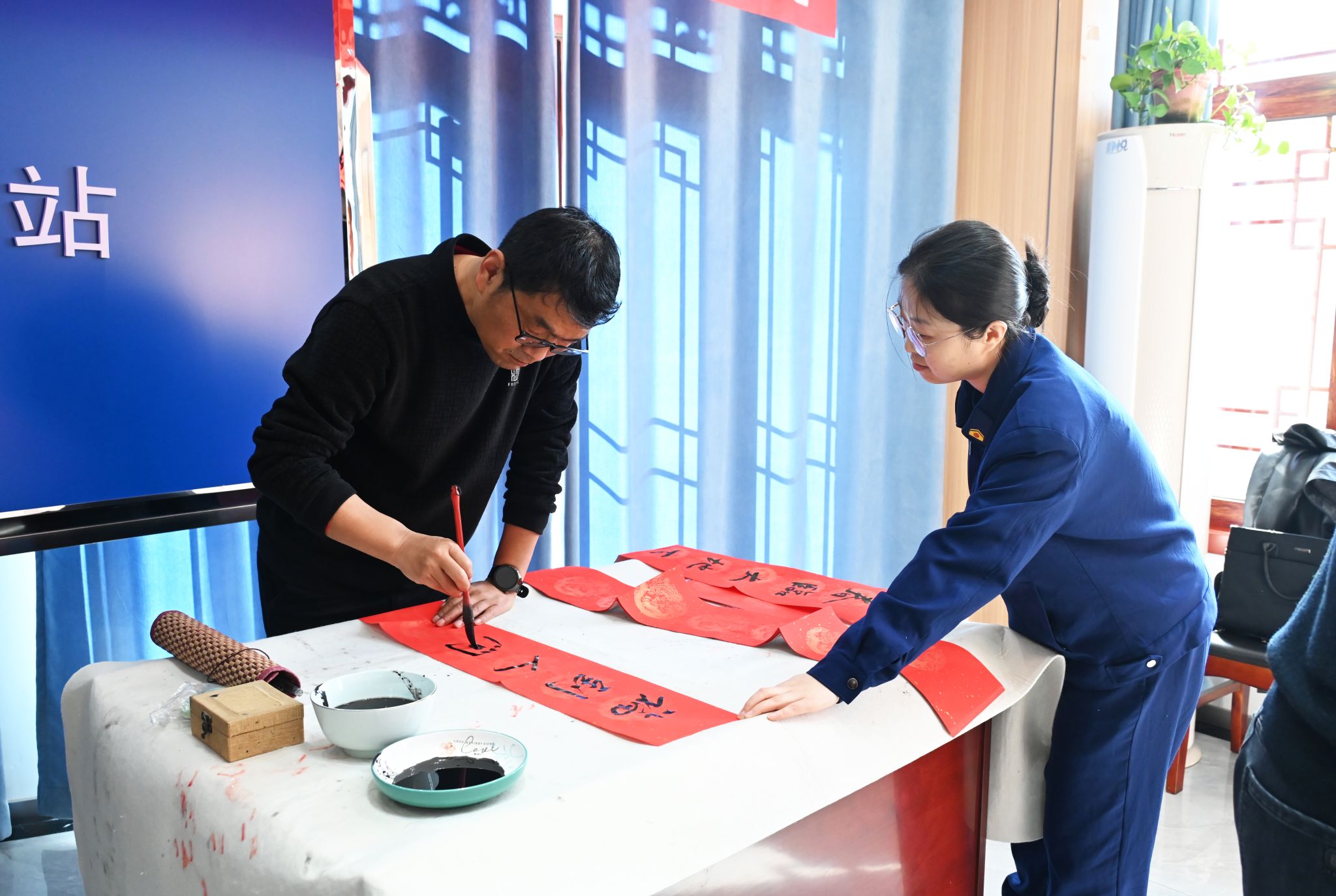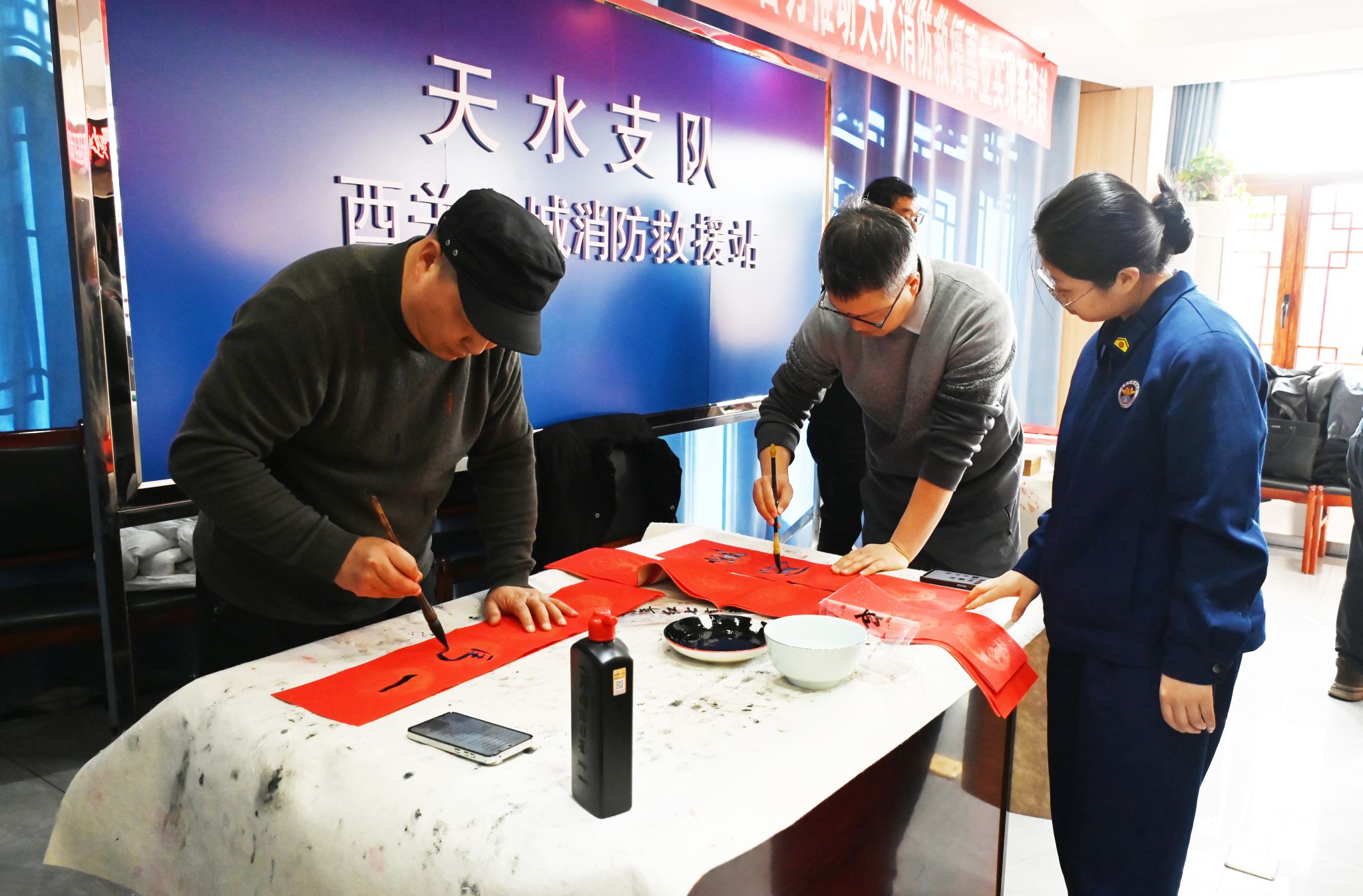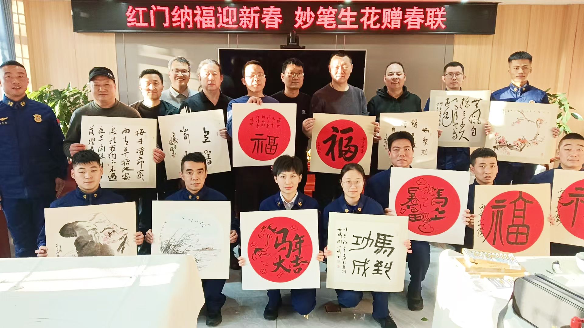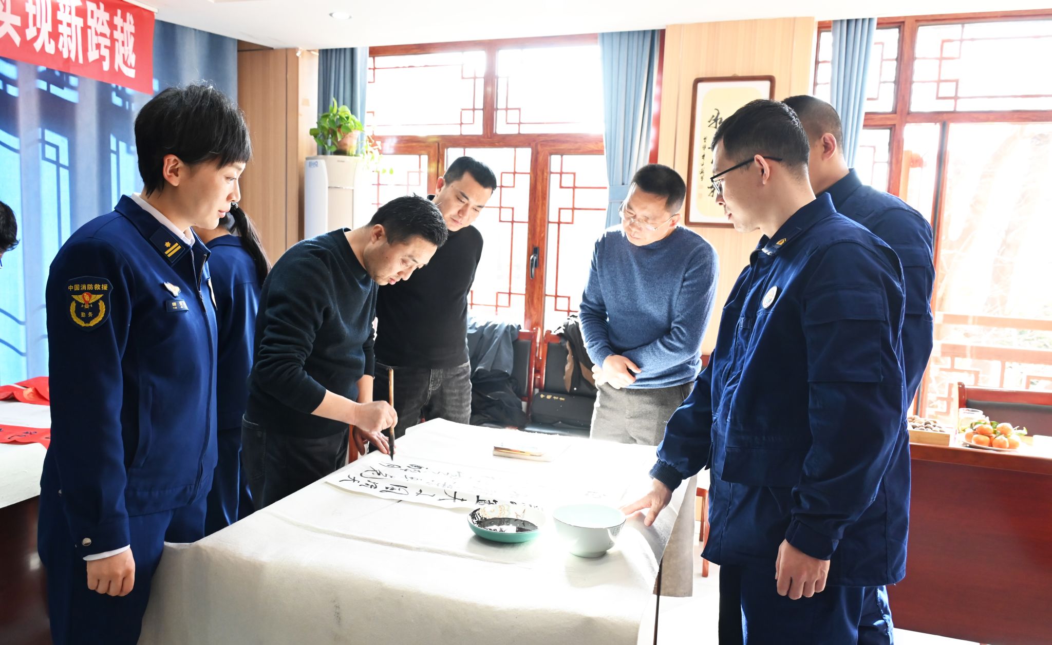 活动现场墨香四溢,红纸铺展。书画老师们挥毫泼墨,笔走龙蛇,将美好的新春祝福凝于笔端。一幅幅寓意吉祥、充满喜庆的春联,一个个雄健生动的“福”字,饱含着对消防指战员的敬意与关怀。火红的春联映衬着“火焰蓝”的忠诚身影,现场年味浓浓,鱼水情暖。