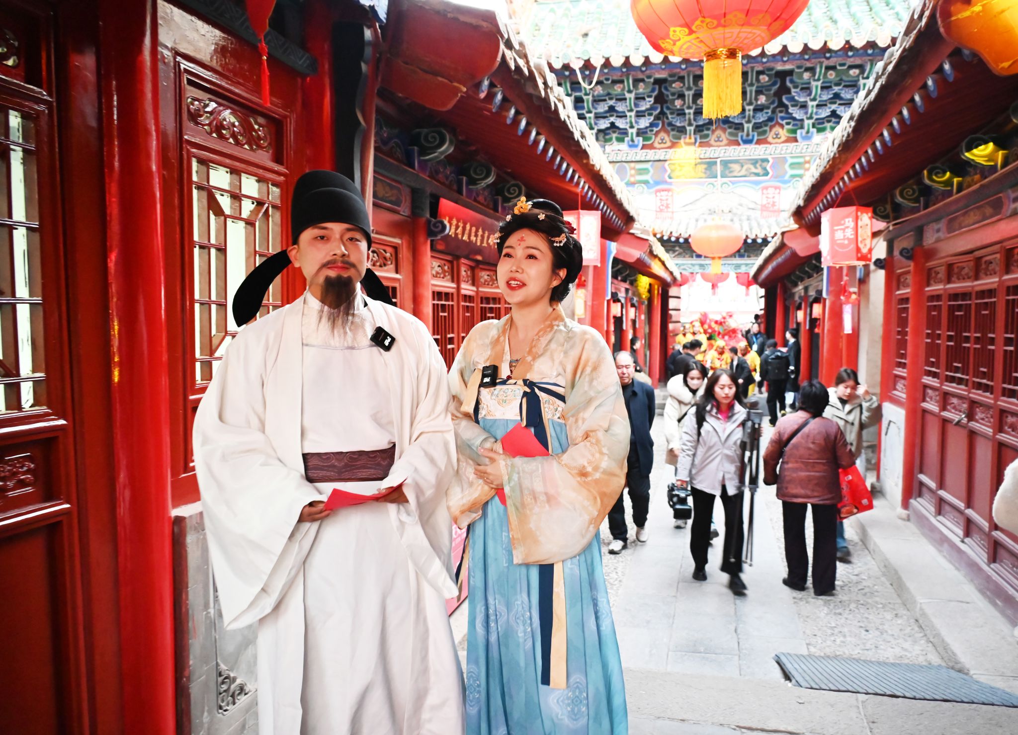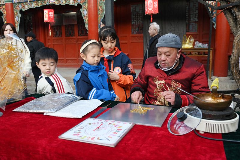紧随舞狮队,“李上”往来经典组合再次现身,“李白”与“上官婉儿”以边走边讲的形式带来生动文化导览,不仅讲解传统舞狮的吉祥寓意和纪信祠的厚重历史,还引导观众参观院内的非遗展示区。非遗传承人现场展示精湛技艺,剪纸的精巧、绒花的绚丽、糖画的香甜,一一呈现在游人面前,引得众多市民驻足观赏。