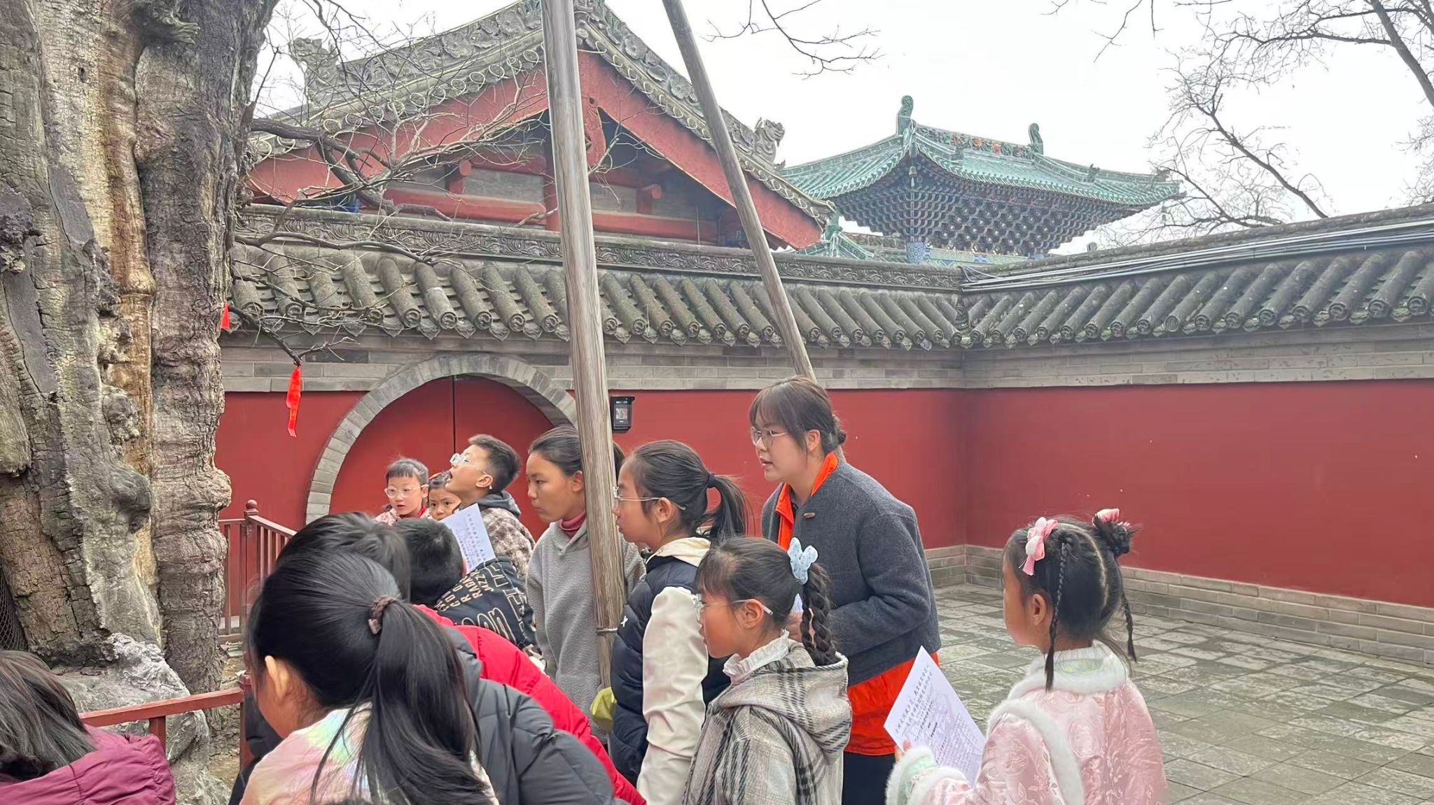 活动中,青少年们近距离观察古柏树皮,触摸其独特的裂纹与纹路,感知岁月厚重,并结合实景讲述伏羲“观鸟兽之文”创画八卦的传说,让大家从古树自然纹理中体会人文始祖探索自然、总结规律的智慧,理解自然与文化的深层渊源。