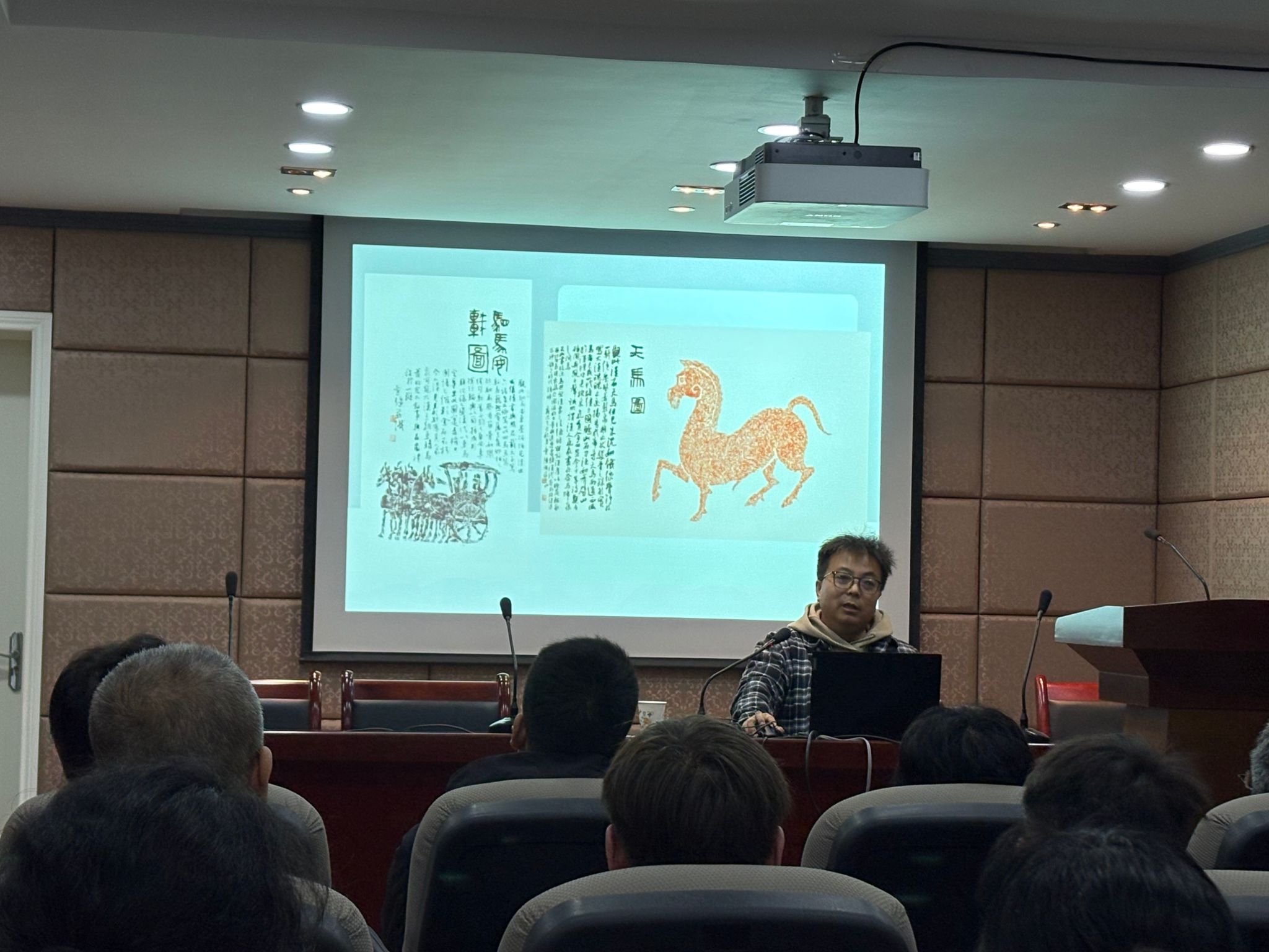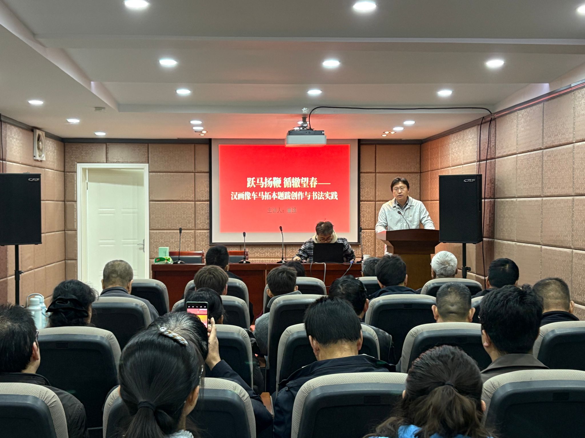 上午举行的汉画像车马拓本题跋专题讲座,特邀青年书法家童强开展《汉画像车马拓本题跋创作与书法实践》主题分享。讲座从汉画像车马的文化内核、跋文撰写、书写章法到当代传承,系统拆解金石题跋的创作路径,重点剖析“车马出行”题材在汉代社会礼仪与舆服制度中的文化意义。