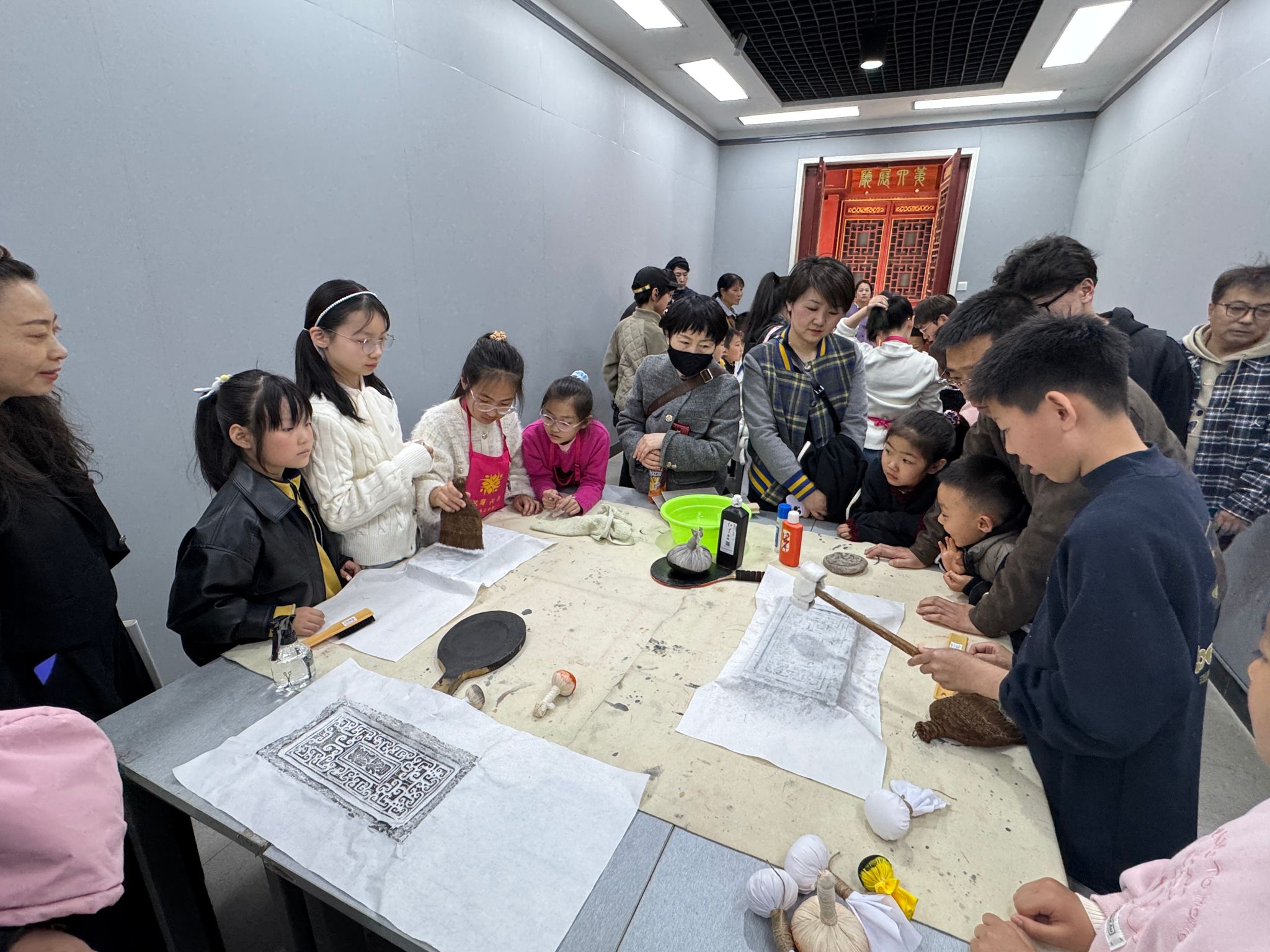 下午同步开展少儿汉画像砖墨拓体验活动。在专业导师指导下,孩子们通过蘸墨、拓印、揭纸等流程,亲手体验传统拓印技艺,将斑驳的砖纹清晰定格于宣纸之上,近距离感受传统技艺的魅力,在实践中播下文化传承的种子。