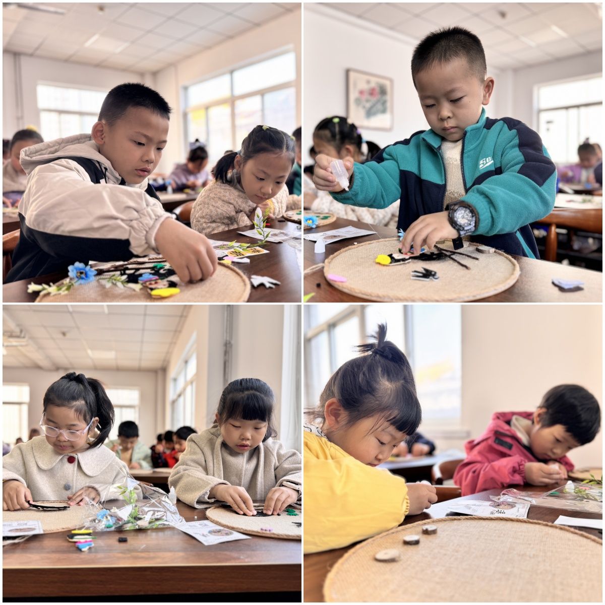 活动伊始,老师为孩子们讲述清明节的由来,分享“寒食”的古老传说,解释为何在这个春意盎然的时节,人们要吃青团、祭先祖、踏青游。在轻松自然的氛围中,让孩子们明白,清明不仅是假期的节点,更是中华民族“追思怀远”的情感纽带。手工制作环节,老师先介绍麻布画的特点与制作方法,再细致示范缠绕粘贴、细节修饰等流程。同学们兴致盎然地动手实践,通过缠绕、弯曲将“柳枝”“牧童”等呈现在画板上,普通麻布变身富有肌理感的春日图景。