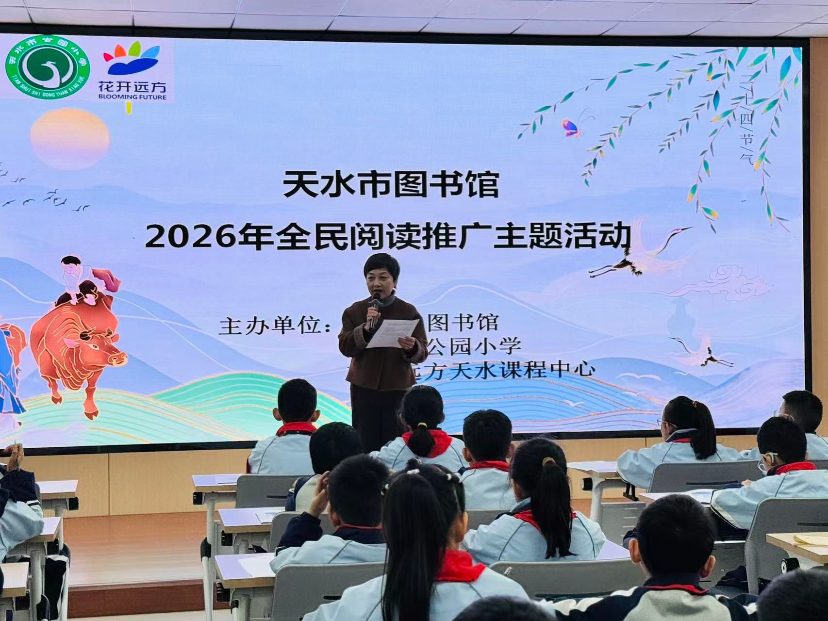 活动开始前,公园小学校长马文礼、天水市图书馆副馆长李东晖为活动致辞。