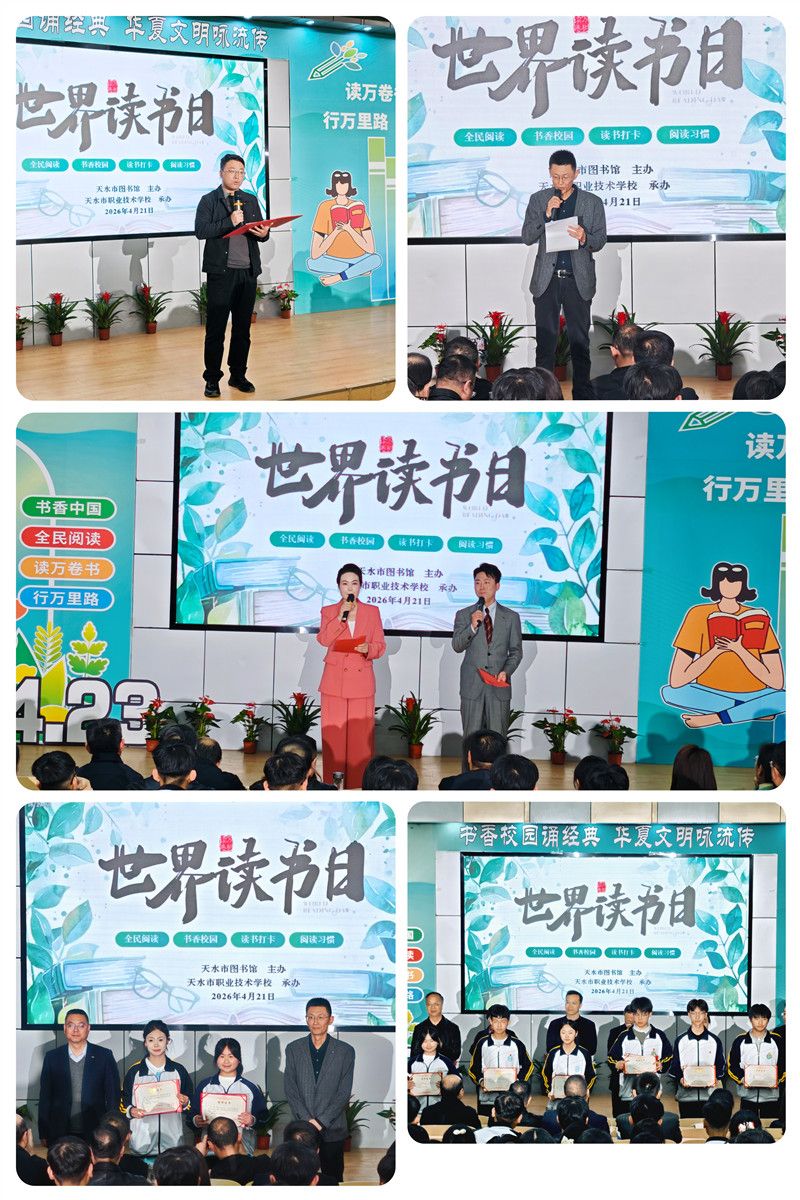 为传承中华优秀传统文化根脉,厚植书香校园文化底蕴,进一步增强广大学生的文化自信与民族认同感,由天水市图书馆主办、天水市职业技术学校承办的“书香校园诵经典 华夏文明咏流传”中华经典诵读比赛,于2026年4月21日下午在天水市职业技术学校礼堂圆满收官。