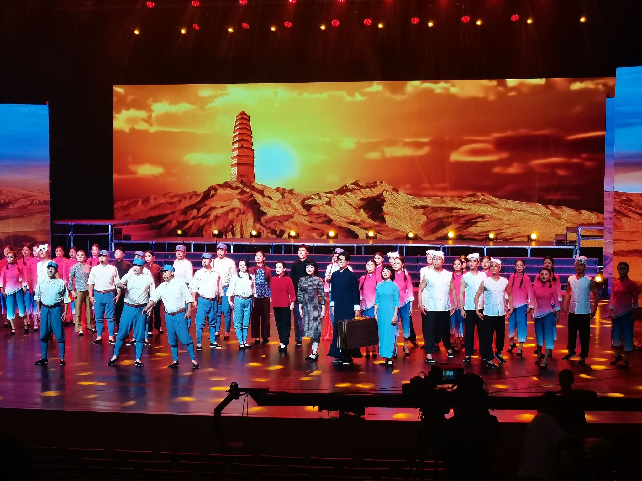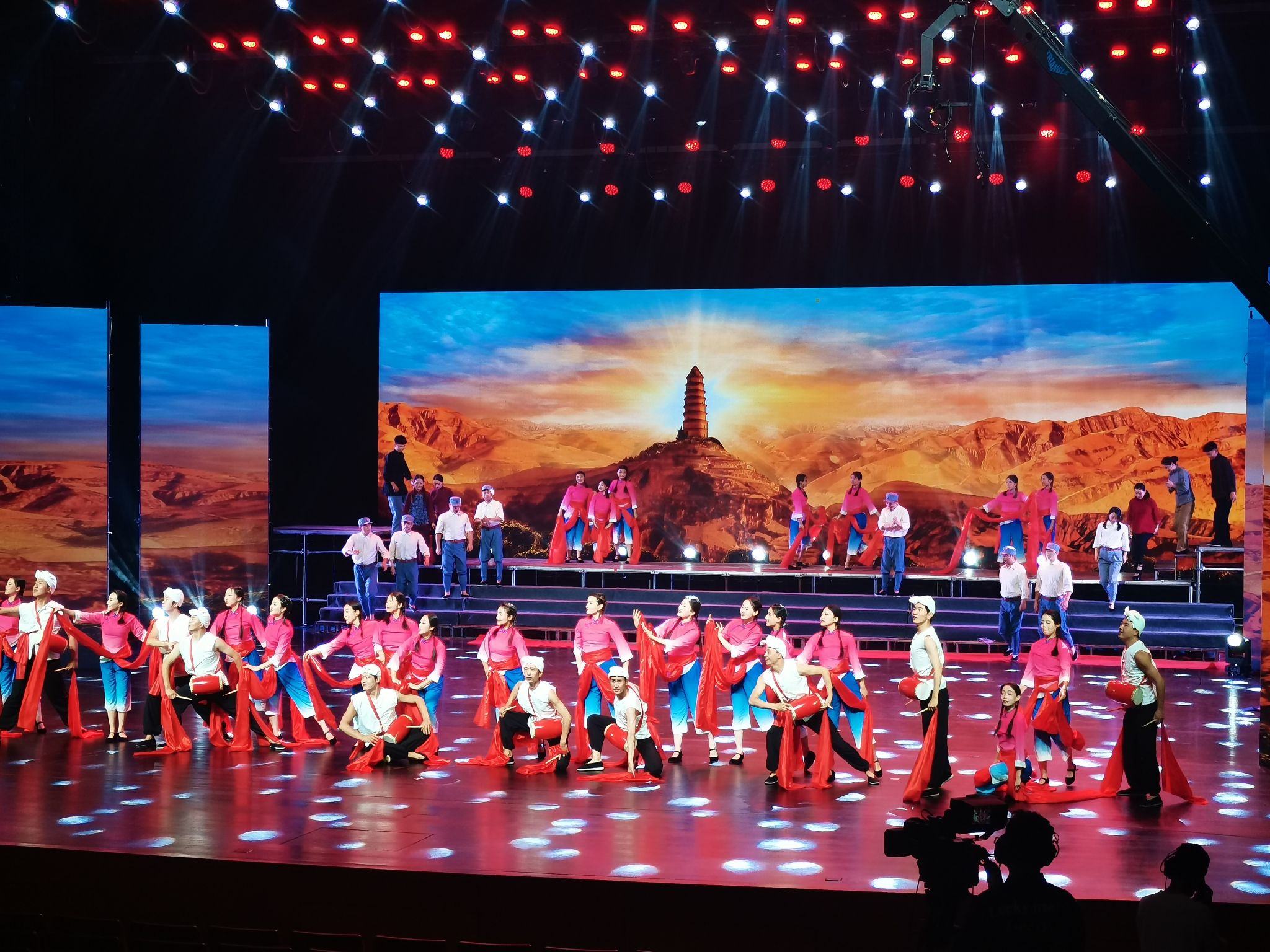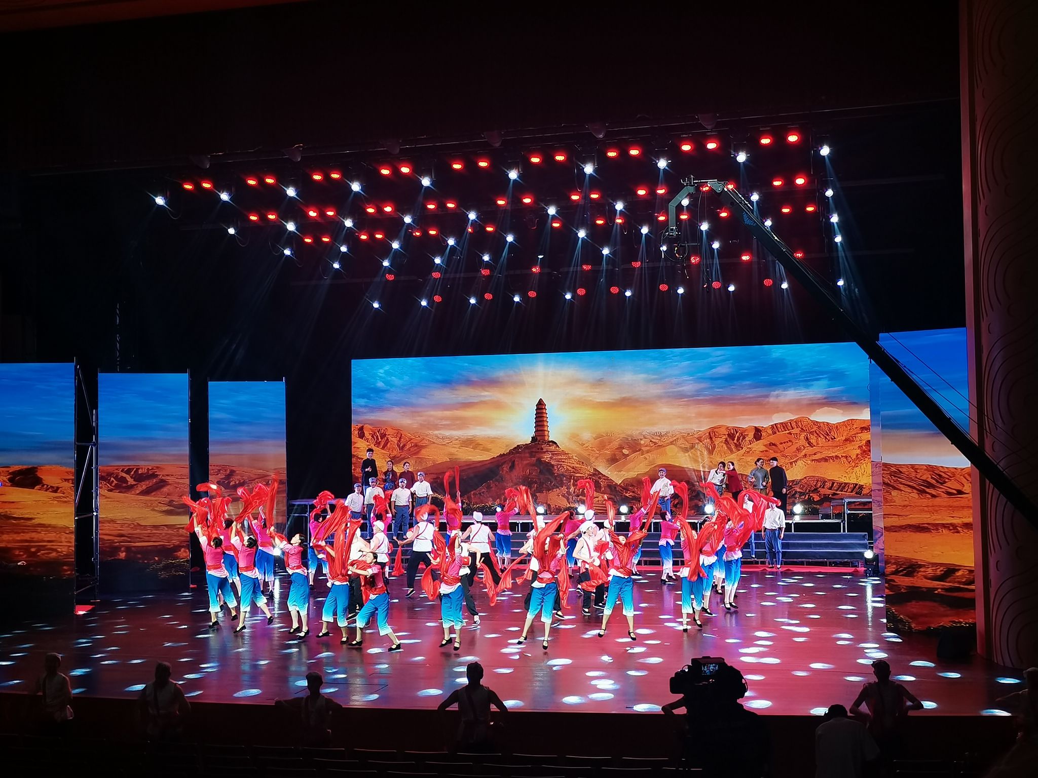 今年6月本台晚会组织单位和导演组在全省范围筛选演出团队和节目,在观看了市歌舞艺术研究中心的排练演出后确定我中心为本台晚会主要演出班底。7月3日导演组到天水后便开始了节目的排练工作,市歌舞艺术研究中心演职人员60余人取消假日,战酷暑精心排练了二十几日,于7月25日赴兰参加合练, 27日晚圆满完成了本台晚会的演出,整台晚会在《山丹丹开花红艳艳》的乐曲中拉开帷幕,《军民大生产》《南泥湾》《延安颂》《妻子》《心中的花儿唱给子弟兵》等一首首耳熟能详的经典歌舞表达了甘肃各族人民对子弟兵的深情厚谊,生动展现了军爱民、民拥军、军民团结一家亲的深厚情谊,描绘出军民携手共创美好未来的壮丽画卷。演出在全场齐声高唱《歌唱祖国》的热烈氛围中落下帷幕,本台晚会得到了我省党政军领导及广大观众的一致好评。