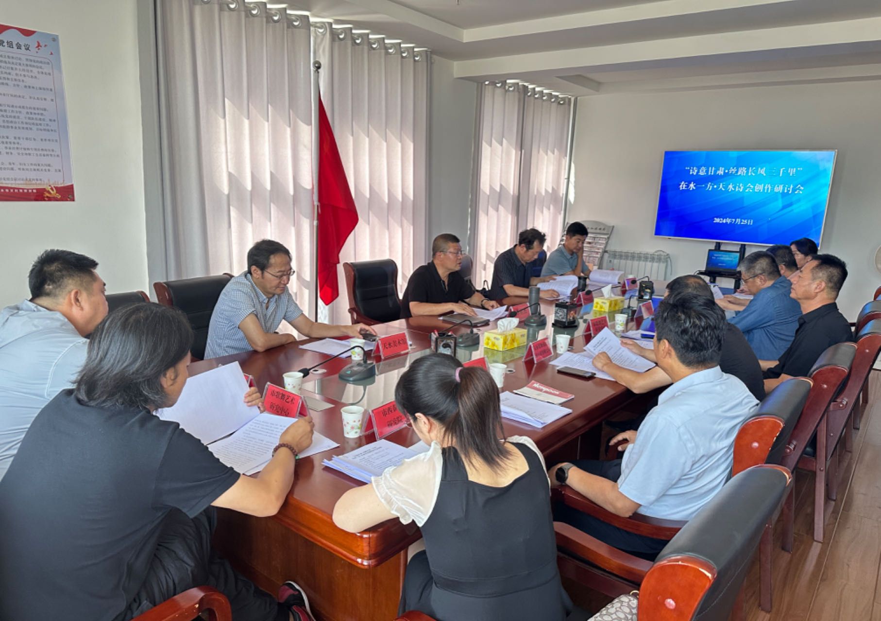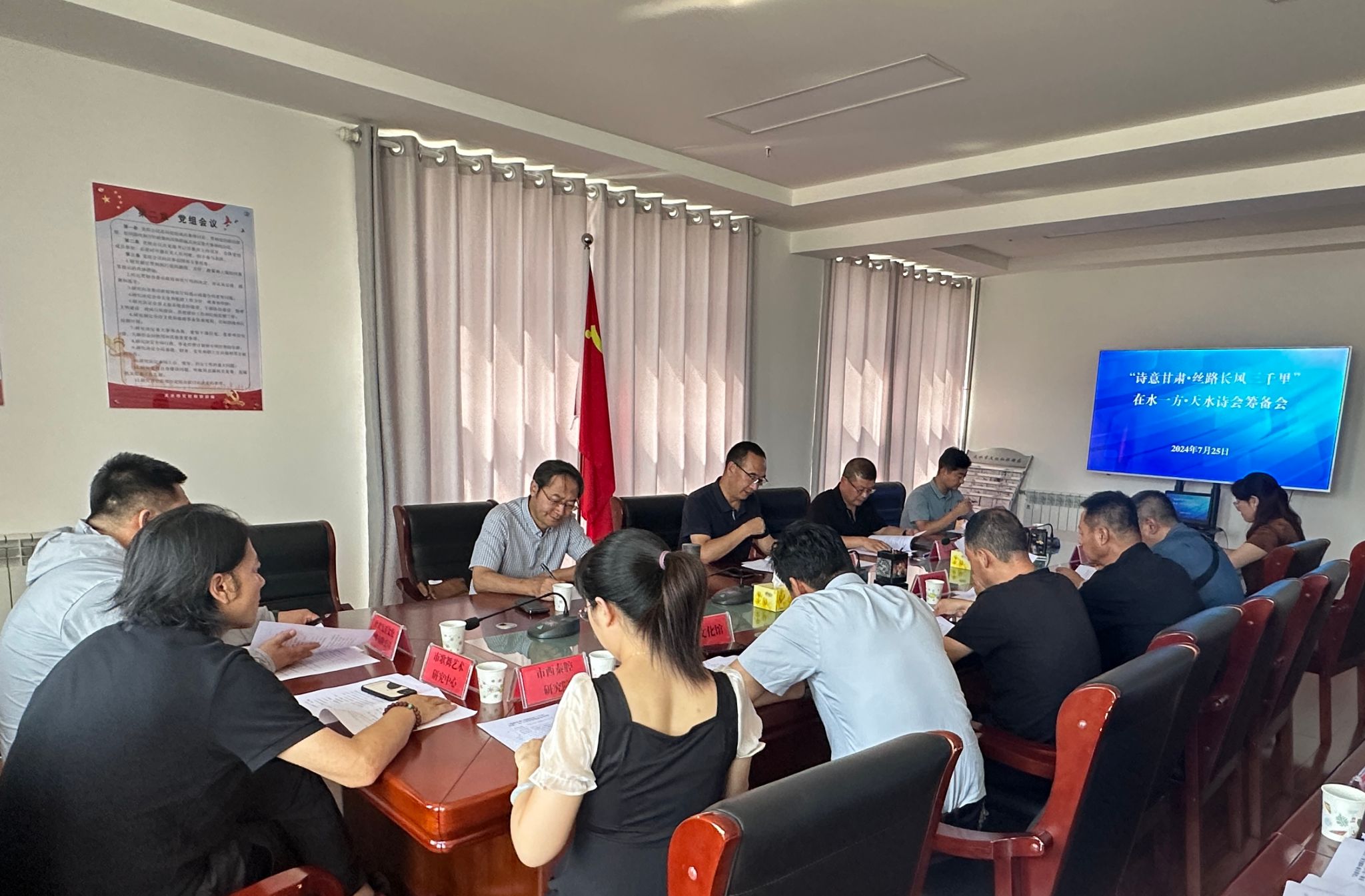 7月25日, “诗意甘肃·丝路长风三千里”在水一方·天水诗会筹备会在天水市文化和旅游局召开。局党组书记、局长牛新虎出席并讲话。天水市文学艺术界联合会、市融媒体中心、市歌舞艺术研究中心、市文化馆、天水美术馆等单位组成的创作团队及局相关科室负责人20余人参加了会议。局党组成员、副局长李星杰主持会议。