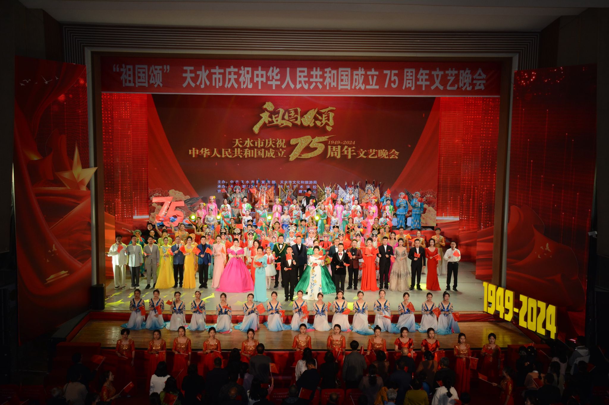 辉煌七十五载,礼赞盛世华章。9月29日晚,由中共天水市委宣传部、天水市文化和旅游局主办,天水市歌舞艺术研究中心、天水艺术学校承办的“祖国颂”天水市庆祝中华人民共和国成立75周年文艺晚会在秦州大剧院成功举办,向全市人民献上了一场激动人心的文化视听盛宴,为祖国母亲献上最诚挚的生日祝福。市领导王文东、沈建玲、董小平、郭庆祥、吴立新等与700余市民一同观看了演出。