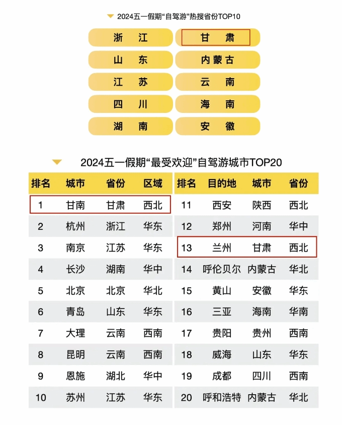 7 自驾游热度持续飙升浙江、山东、江苏成为热门选择2024“五一”假期“自驾游”热度飙升,环比搜索增长279%,热门省份TOP10为浙江、山东、江苏、四川、湖南、甘肃、内蒙古、云南、海南和安徽。其中,甘南、杭州、南京、长沙、北京、青岛、大理、昆明、恩施、苏州,成为自驾游的首选目的地。(来源:微游甘肃)