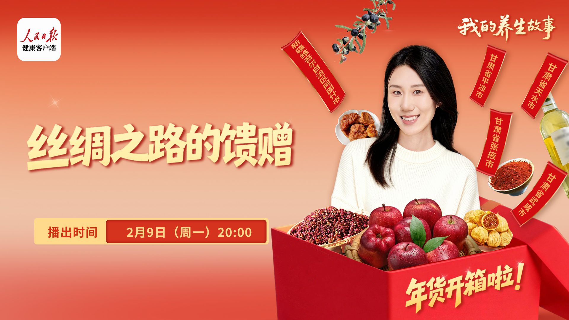 新春佳节将至,人民日报健康客户端邀请天水文旅参加“我的养生故事·年货开箱啦”特别策划系列直播活动。本期活动是人民日报健康客户端为2026“乐购新春”春节特别活动的一次重要预热,以“解锁丝绸之路养生中国年”为主题,旨在聚焦丝路养生文化,赋能地方农文旅融合发展。天水文旅依托国家权威平台,以开箱年货大礼包的形式,对天水独特的养生资源、特色农产品和城市文化进行了一次高规格、广覆盖、立体化的融合性宣推。