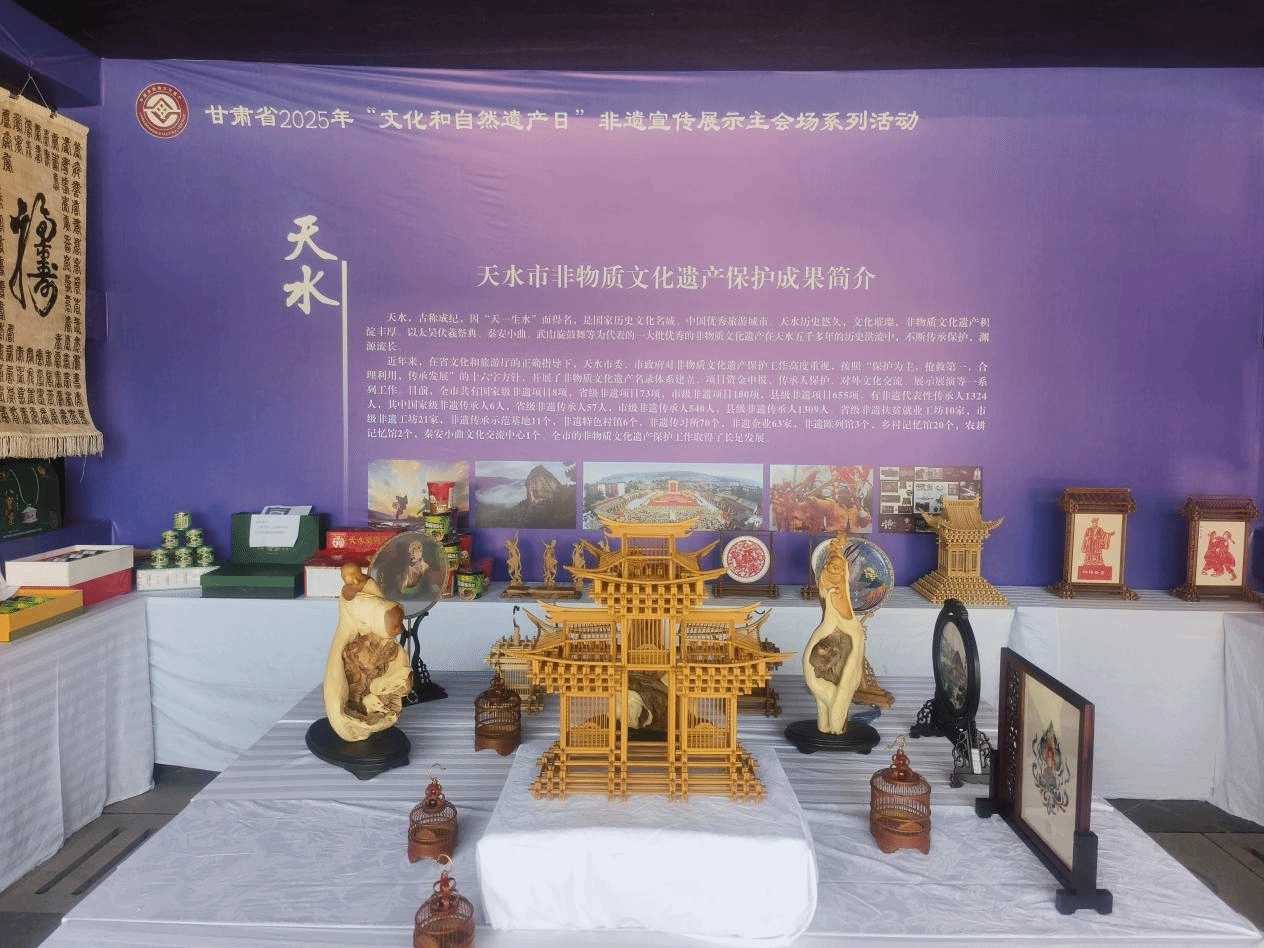 今年“文化和自然遗产日”非遗宣传展示展销主会场活动,我市遴选天水雕漆、天水丝毯、关峡竹编、清水剪纸、甘谷麻鞋、秦安草编、麦积木雕、武山夜光杯雕、武山柳编技艺、天水呱呱、天水麻辣烫、张川特色小吃等500余件非遗精品和天水特色风味小吃参加了展示展销活动。