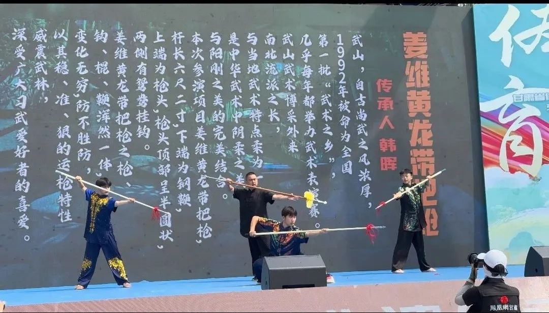 武山县文旅局推荐的省级非遗代表性项目黄龙带把枪,以枪鞭组合的独特器械、内外兼修的套路组合、攻防兼备的严谨结构、灵活多变的技法呈现以及刚柔并济、气势如虹的演绎,从全省41项非遗项目中脱颖而出,斩获最佳表演奖。这场精彩的技艺对话,由市级代表性传承人韩晖携弟子共同完成,展示了武山非遗保护传承的最新成果,书写了“全国武术之乡”的又一辉煌篇章。