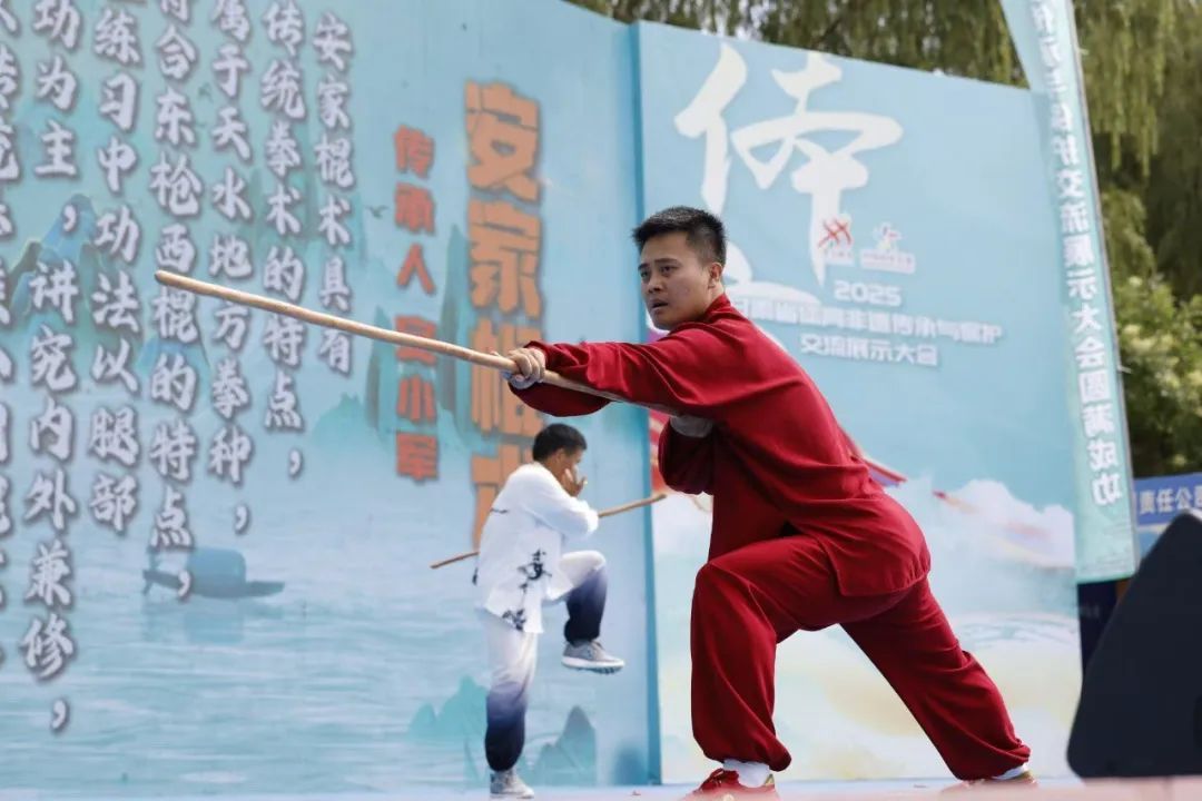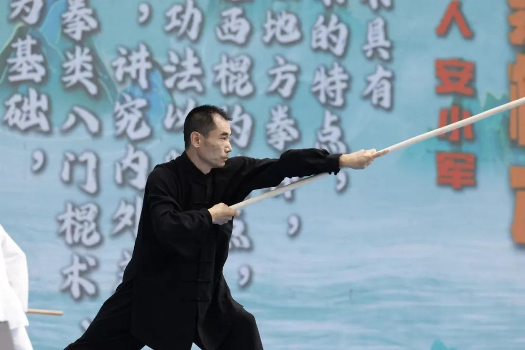 安家棍术又名“鹞子搜林棍”,以传统拳类八门棍术、少林棍术为基础,重用一梢棍技击,结合身法、意念,是一项内外兼修的棍术套路。其功法以腿部桩功为主,套路布局短小精悍,柔中带刚,技击讲究以静制动、后法制敌。表演时,“安家棍术”的传承者们动作行云流水,抱、劈、撩、扫等动作一气呵成,发力讲究“腰胯驱动,力透棍梢”,把法灵活,兼枪带棍,变换无穷,将速度、力度、技巧完美结合,实战性展露无遗,充分展现了这一古老棍术的独特魅力,赢得了现场观众的阵阵掌声与欢呼声。