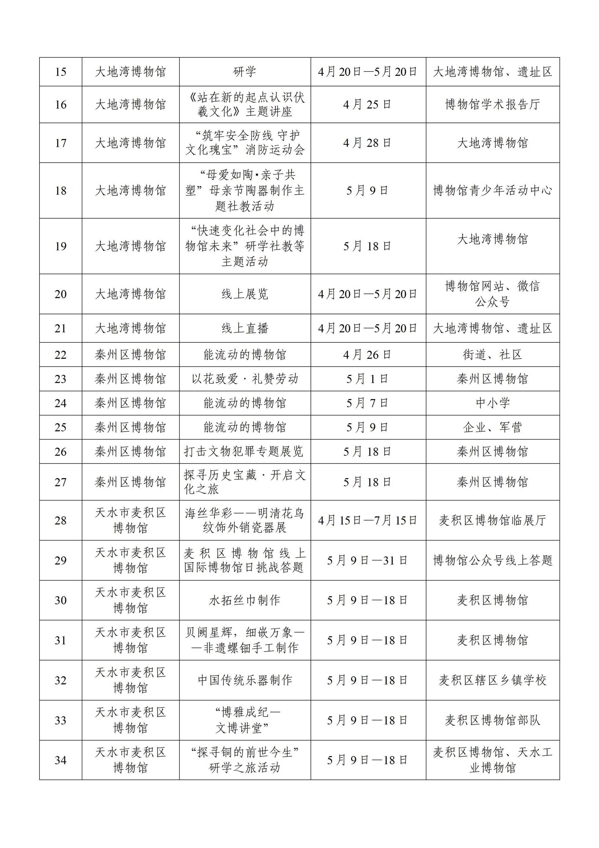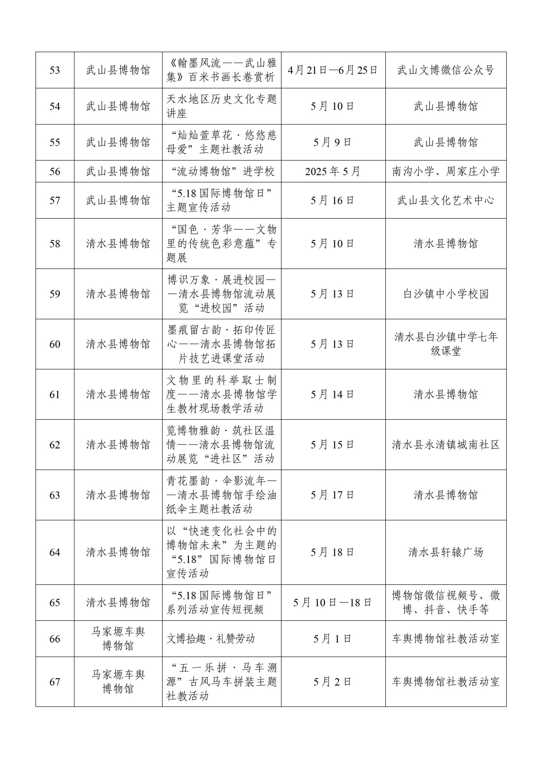 为迎接第49个国际博物馆日,天水市各级博物馆纪念馆精心策划推出110余项内容丰富、形式多样的“线上+线下”宣传活动,旨在通过临时展览、馆际合作、学术交流、社会教育、主题游径等形式,为观众搭建文化传承与科技创新的多元体验场景,增进公众对博物馆的认知与参与,特邀您一起走进博物馆,共赴一场文化之约!