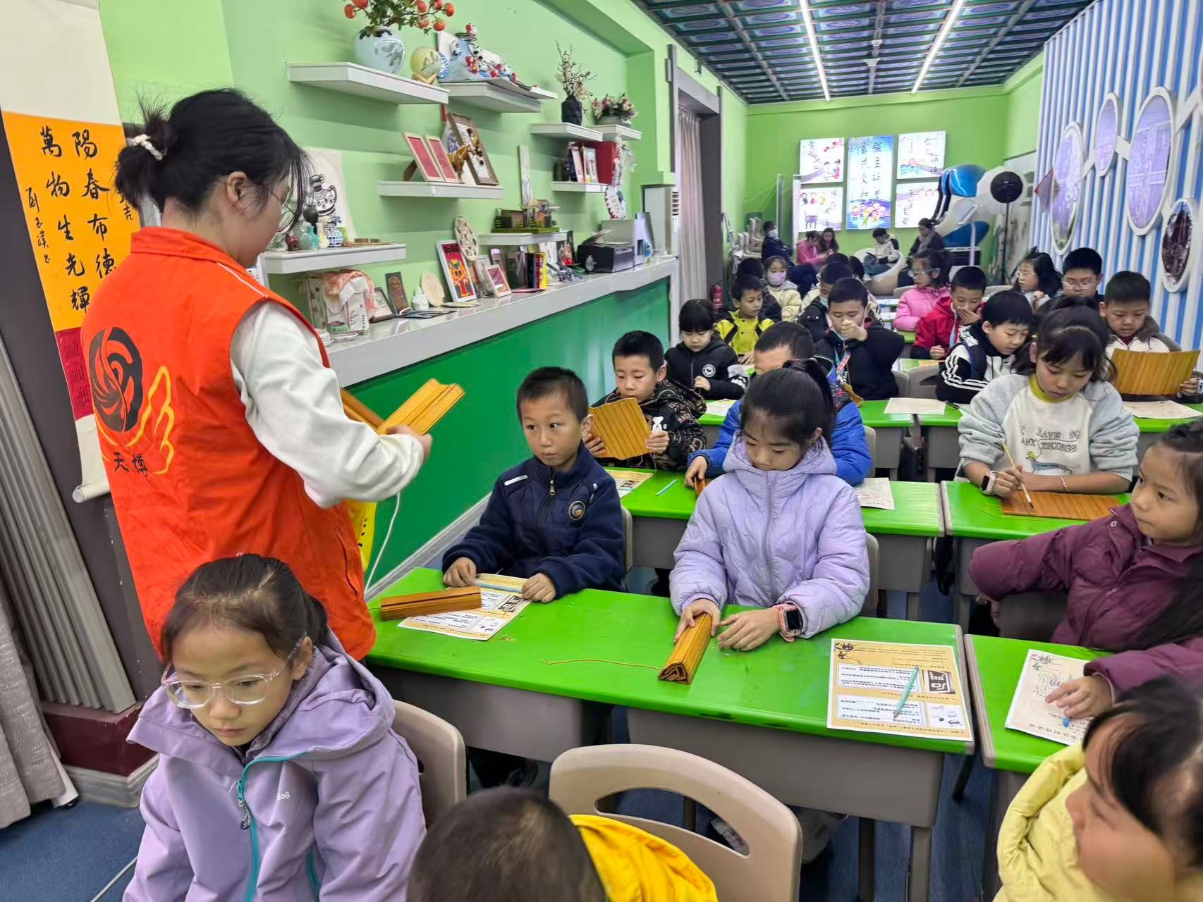 实践环节里,宣教老师耐心示范竹简拼接、毛笔握法、墨汁调试及书写要点。青少年们兴致盎然,蘸墨挥毫在竹简上书写经典诗词与吉祥文字,现场交流互助,一幅幅兼具古韵与童真的作品陆续诞生。